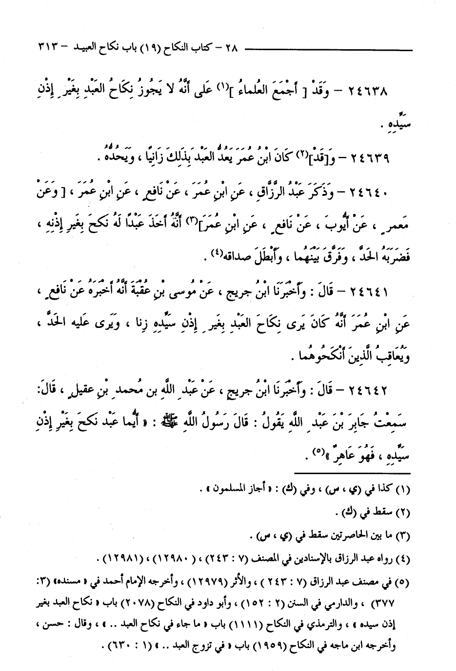 24641 - قَالَ: وَأَخْبَرَنَا ابْنُ جُرَيْجٍ، عَنْ مُوسَى بْنِ عُقْبَةَ أَنَّهُ أَخْبَرَهُ عَنْ نَافِعٍ، عَنِ ابْنِ عُمَرَ أَنَّهُ كَانَ يَرَى نِكَاحَ الْعَبْدِ بِغَيْرِ إِذْنِ سَيِّدِهِ زِنًا، وَيَرَى عَلَيْهِ الْحَدَّ، وَيُعَاقِبُ الَّذِينَ أَنْكَحُوهُمَا.