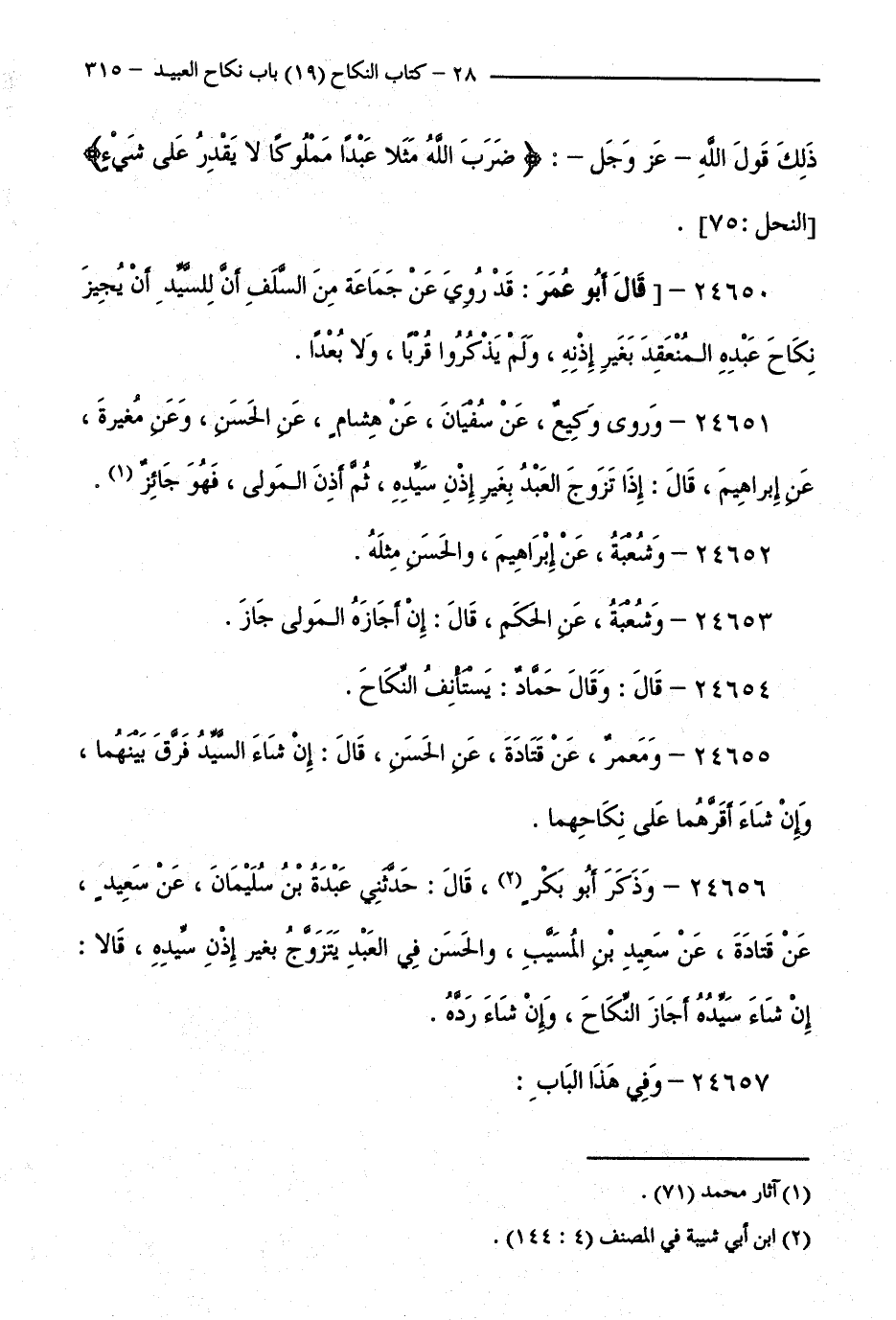 24656 - وَذَكَرَ أَبُو بَكْرٍ، قَالَ: حَدَّثَنِي عَبْدَةُ بْنُ سُلَيْمَانَ، عَنْ سَعِيدٍ، عَنْ قَتَادَةَ، عَنْ سَعِيدِ بْنِ الْمُسَيَّبِ، وَالْحَسَنِ فِي الْعَبْدِ يَتَزَوَّجُ بِغَيْرِ إِذْنِ سَيِّدِهِ، قَالَا: إِنْ شَاءَ سَيِّدُهُ أَجَازَ النِّكَاحَ، وَإِنْ شَاءَ رَدَّهُ.