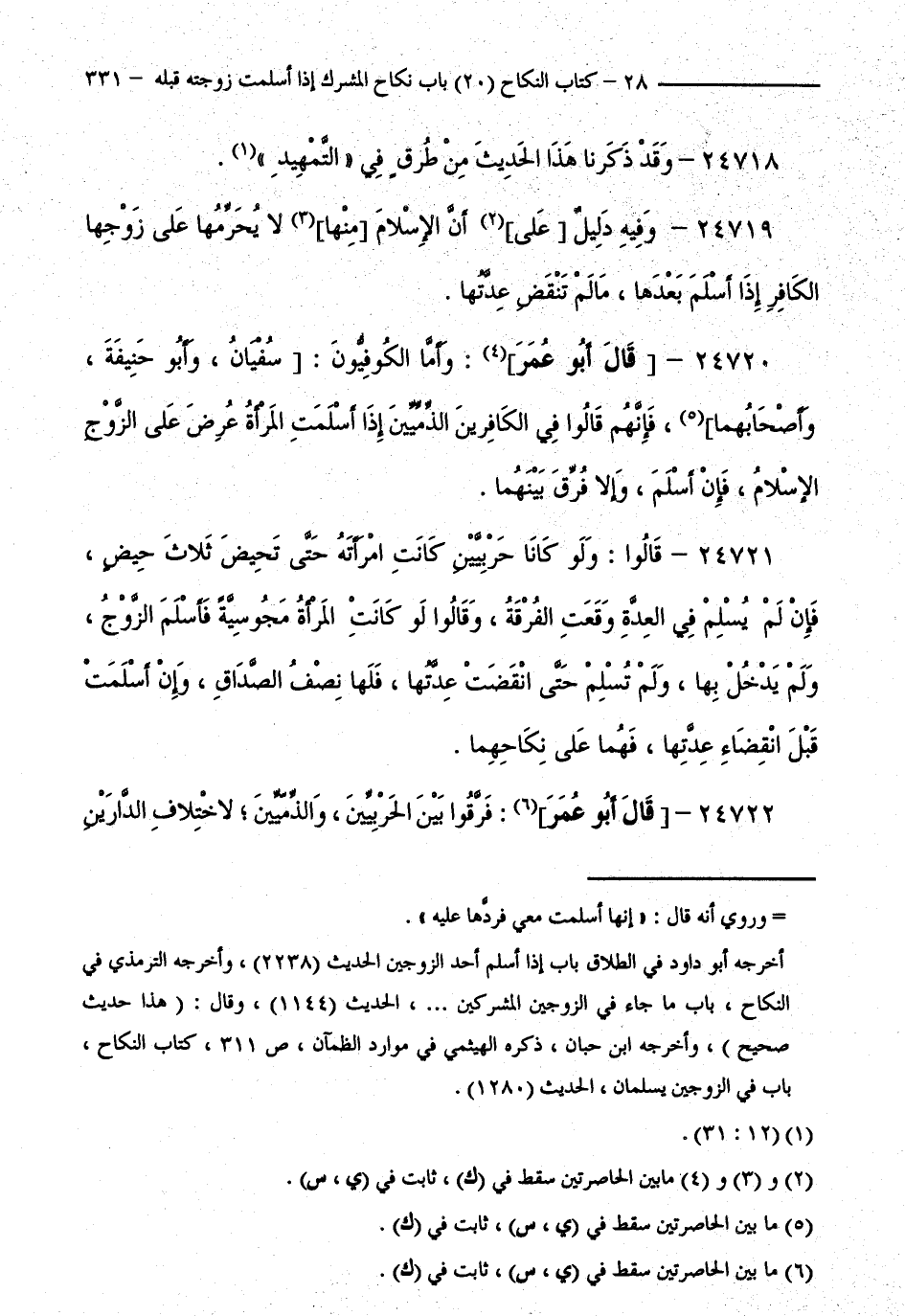 24720 - قَالَ أَبُو عُمَرَ: وَأَمَّا الْكُوفِيُّونَ: سُفْيَانُ، وَأَبُو حَنِيفَةَ، وَأَصْحَابُهُمَا، فَإِنَّهُمْ قَالُوا فِي الْكَافِرِينَ الذِّمِّيِّينَ إِذَا أَسْلَمَتِ الْمَرْأَةُ عُرِضَ عَلَى الزَّوْجِ الْإِسْلَامُ، فَإِنْ أَسْلَمَ، وَإِلَّا فُرِّقَ بَيْنَهُمَا.