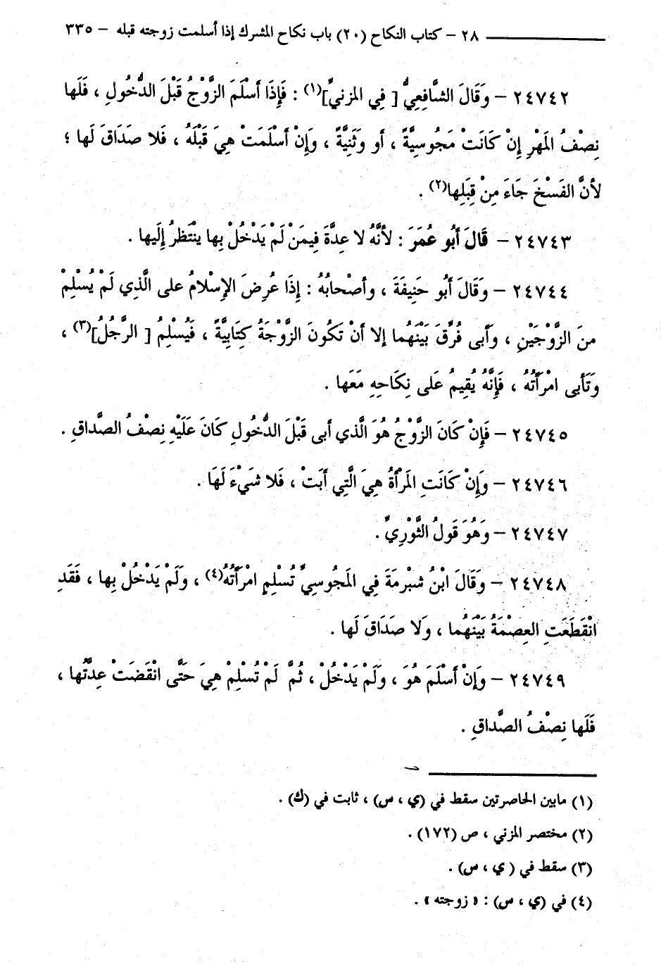 24744 - وَقَالَ أَبُو حَنِيفَةَ، وَأَصْحَابُهُ: إِذَا عُرِضَ الْإِسْلَامُ عَلَى الَّذِي لَمْ يُسْلِمْ مِنَ الزَّوْجَيْنِ وَأَبَى، فُرِّقَ بَيْنَهُمَا إِلَّا أَنْ تَكُونَ الزَّوْجَةُ كِتَابِيَّةً، فَيُسْلِمُ الرَّجُلُ، وَتَأْبَى امْرَأَتُهُ، فَإِنَّهُ يُقِيمُ عَلَى نِكَاحِهِ مَعَهَا.