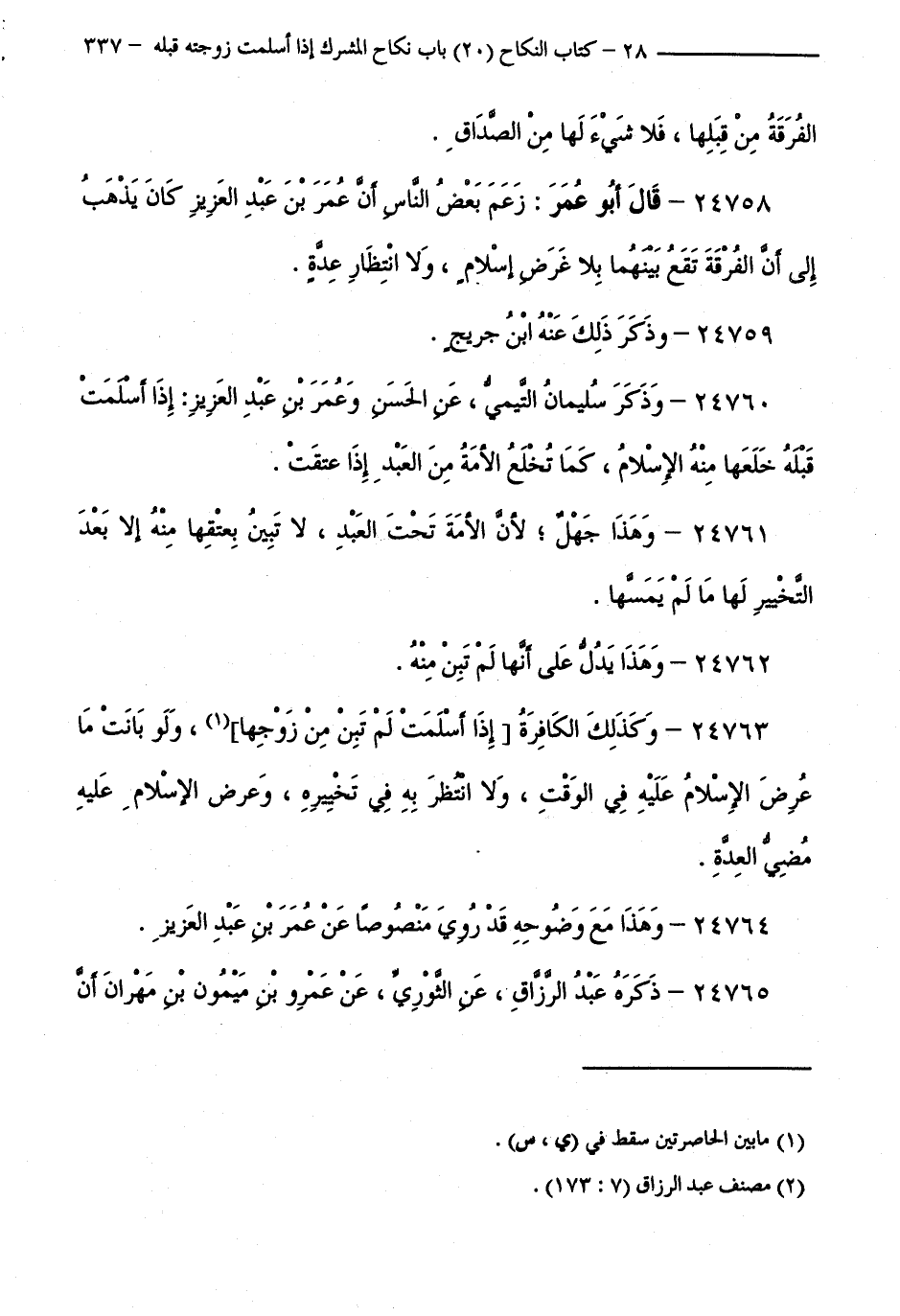 24758 - قَالَ أَبُو عُمَرَ: زَعَمَ بَعْضُ النَّاسِ أَنَّ عُمَرَ بْنَ عَبْدِ الْعَزِيزِ كَانَ يَذْهَبُ إِلَى أَنَّ الْفُرْقَةَ تَقَعُ بَيْنَهُمَا بِلَا عَرْضِ إِسْلَامٍ، وَلَا انْتِظَارِ عِدَّةٍ.