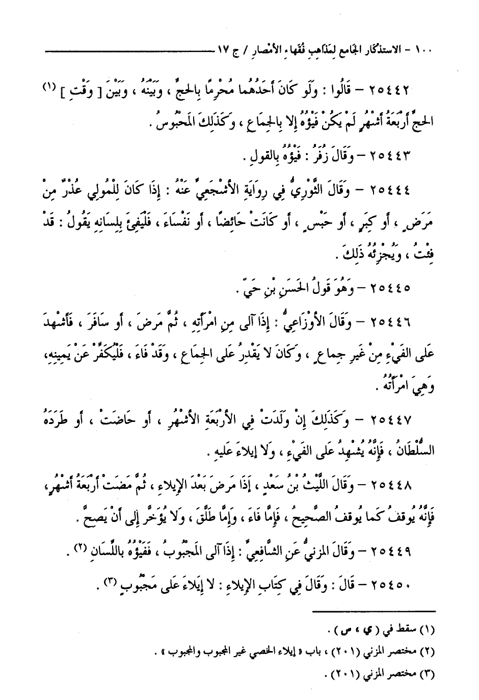 25442 - قَالُوا: وَلَوْ كَانَ أَحَدُهُمَا مُحْرِمًا بِالْحَجِّ، وَبَيْنَهُ وَبَيْنَ وَقْتِ الْحَجِّ أَرْبَعَةُ أَشْهُرٍ لَمْ يَكُنْ فَيْؤُهُ إِلَّا بِالْجِمَاعِ، وَكَذَلِكَ الْمَحْبُوسُ.