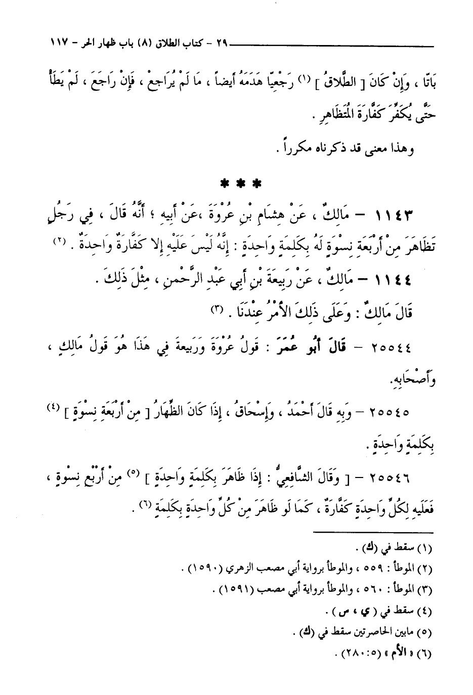 1143 - مَالِكٌ، عَنْ هِشَامِ بْنِ عُرْوَةَ، عَنْ أَبِيهِ ; أَنَّهُ قَالَ، فِي رَجُلٍ تَظَاهَرَ مِنْ أَرْبَعَةِ نِسْوَةٍ لَهُ بِكَلِمَةٍ وَاحِدَةٍ: أَنَّهُ لَيْسَ عَلَيْهِ إِلَّا كَفَّارَةٌ وَاحِدَةٌ.