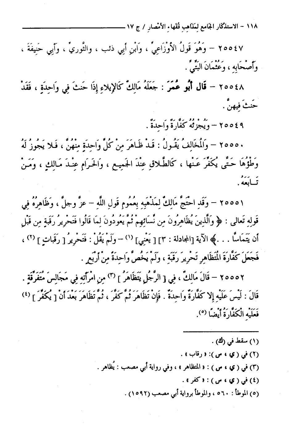 25551 - وَقَدِ احْتَجَّ مَالِكٌ لِمَذْهَبِهِ بِعُمُومِ قَوْلِ اللَّهِ - عَزَّ وَجَلَّ وَظَاهِرِهِ فِي قَوْلِهِ تَعَالَى:وَالَّذِينَ يُظَاهِرُونَ مِنْ نِسَائِهِمْ ثُمَّ يَعُودُونَ لِمَا قَالُوا فَتَحْرِيرُ رَقَبَةٍ مِنْ قَبْلِ أَنْ يَتَمَاسَّا الْآيَةَ [ الْمُجَادَلَةِ: 3 ] يَعْنِي - وَلَمْ يَقُلْ: فَتَحْرِيرُ رَقَبَاتٍ، فَجَعَلَ كَفَّارَةَ الْمُتَظَاهِرِ تَحْرِيرَ رَقَبَةٍ، وَلَمْ يَخُصَّ وَاحِدَةً مِنْ أَرْبَعٍ.