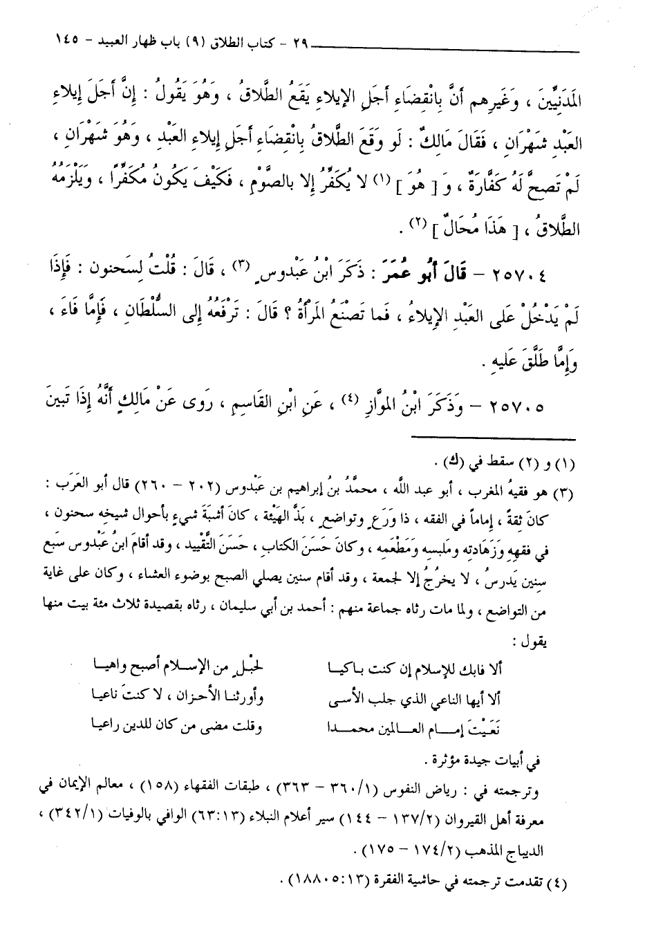 25704 - قَالَ أَبُو عُمَرَ: ذَكَرَ ابْنُ عَبْدُوسٍ، قَالَ: قُلْتُ لِسَحْنُونٍ: فَإِذَا لَمْ يَدْخُلْ عَلَى الْعَبْدِ الْإِيلَاءُ، فَمَا تَصْنَعُ الْمَرْأَةُ ؟ قَالَ: تَرْفَعُهُ إِلَى السُّلْطَانِ، فَإِمَّا فَاءَ، وَإِمَّا طَلَّقَ عَلَيْهِ.