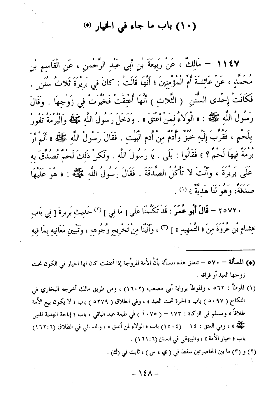 1147 - مَالِكٌ، عَنْ رَبِيعَةَ بْنِ أَبِي عَبْدِ الرَّحْمَنِ، عَنِ الْقَاسِمِ بْنِ مُحَمَّدٍ،عَنْ عَائِشَةَ أُمِّ الْمُؤْمِنِينَ ; أَنَّهَا قَالَتْ: كَانَ فِي بَرِيرَةَ ثَلَاثُ سُنَنٍ. فَكَانَتْ إِحْدَى السُّنَنِ الثَّلَاثِ أَنَّهَا أُعْتِقَتْ فَخُيِّرَتْ فِي زَوْجِهَا. وَقَالَ رَسُولُ اللَّهِ صَلَّى اللَّهُ عَلَيْهِ وَسَلَّمَ: الْوَلَاءُ لِمَنْ أَعْتَقَ. وَدَخَلَ رَسُولُ اللَّهِ صَلَّى اللَّهُ عَلَيْهِ وَسَلَّمَ وَالْبُرْمَةُ تَفُورُ بِلَحْمٍ، فَقُرِّبَ إِلَيْهِ خُبْزٌ وَأُدْمٌ مِنْ أُدْمِ الْبَيْتِ. فَقَالَ رَسُولُ اللَّهِ صَلَّى اللَّهُ عَلَيْهِ وَسَلَّمَ أَلَمْ أَرَ بُرْمَةً فِيهَا لَحْمٌ ؟ فَقَالُوا: بَلَى. يَا رَسُولَ اللَّهِ. وَلَكِنَّ ذَلِكَ لَحْمٌ تُصُدِّقَ بِهِ عَلَى بَرِيرَةَ، وَأَنْتَ لَا تَأْكُلُ الصَّدَقَةَ. فَقَالَ رَسُولُ اللَّهِ صَلَّى اللَّهُ عَلَيْهِ وَسَلَّمَ: هُوَ عَلَيْهَا صَدَقَةٌ، وَهُوَ لَنَا هَدِيَّةٌ.