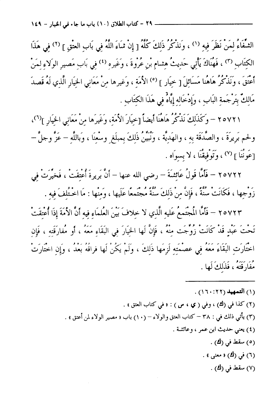 الشِّفَاءُ لِمَنْ نَظَرَ فِيهِ، وَنَذْكُرُ ذَلِكَ كُلَّهُ إِنْ شَاءَ اللَّهُ فِي بَابِ الْعِتْقِ فِي هَذَا الْكِتَابِ، فَهُنَاكَ يَأْتِي حَدِيثُ هِشَامِ بْنِ عُرْوَةَ، وَغَيْرِهِ فِي بَابِ مَصِيرِ الْوَلَاءِ لِمَنْ أَعْتَقَ، وَنَذْكُرُ هَاهُنَا مَسَائِلَ خِيَارِ الْأَمَةِ وَغَيْرَهَا مِنْ مَعَانِي الْخِيَارِ الَّذِي لَهُ قَصَدَ مَالِكٌ بِتَرْجَمَةِ الْبَابِ، وَإِدْخَالِهِ إِيَّاهُ فِي هَذَا الْكِتَابِ.