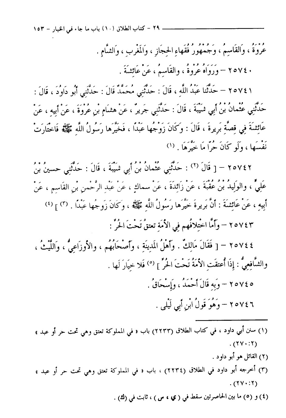 25741 - حَدَّثَنَا عَبْدُ اللَّهِ، قَالَ: حَدَّثَنِي مُحَمَّدٌ قَالَ: حَدَّثَنِي أَبُو دَاوُدَ، قَالَ: حَدَّثَنِي عُثْمَانُ بْنُ أَبِي شَيْبَةَ، قَالَ: حَدَّثَنِي جَرِيرٌ، عَنْ هِشَامِ بْنِ عُرْوَةَ، عَنْ أَبِيهِ، عَنْ عَائِشَةَفِي قِصَّةِ بَرِيرَةَ، قَالَ: وَكَانَ زَوْجُهَا عَبْدًا، فَخَيَّرَهَا رَسُولُ اللَّهِ صَلَّى اللَّهُ عَلَيْهِ وَسَلَّمَ فَاخْتَارَتْ نَفْسَهَا، وَلَوْ كَانَ حُرًّا مَا خَيَّرَهَا.