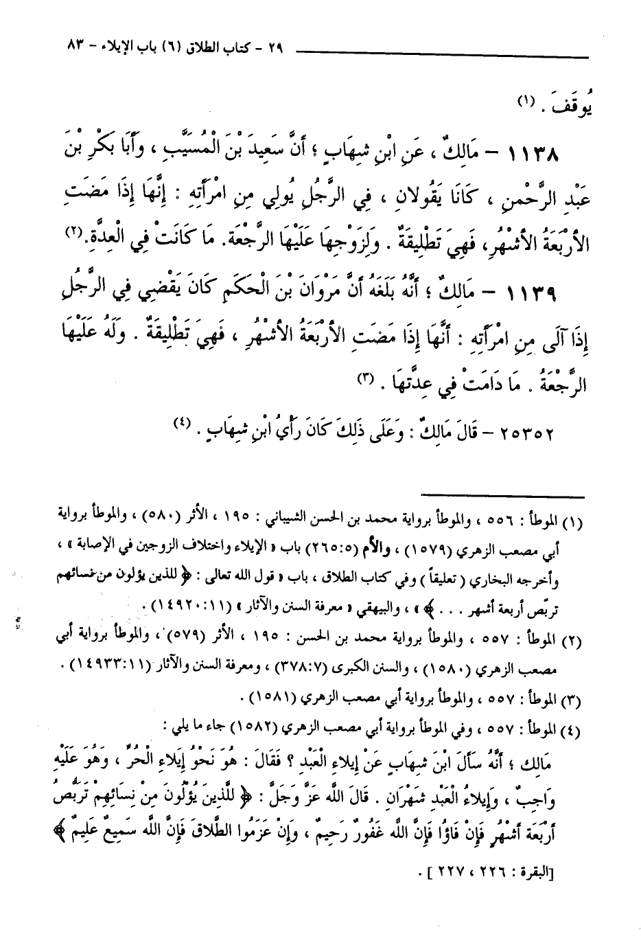 1138 - مَالِكٌ، عَنِ ابْنِ شِهَابٍ ; أَنَّ سَعِيدَ بْنَ الْمُسَيَّبِ، وَأَبَا بَكْرِ بْنَ عَبْدِ الرَّحْمَنِ، كَانَا يَقُولَانِ، فِي الرَّجُلِ يُولِي مِنَ امْرَأَتِهِ: إِنَّهَا إِذَا مَضَتِ الْأَرْبَعَةُ الْأَشْهُرِ فَهِيَ تَطْلِيقَةٌ. وَلِزَوْجِهَا عَلَيْهَا الرَّجْعَةُ. مَا كَانَتْ فِي الْعِدَّةِ.