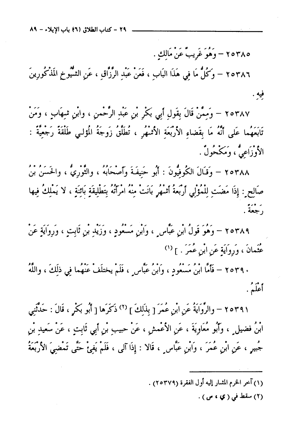 25391 - وَالرِّوَايَةُ عَنِ ابْنِ عُمَرَ بِذَلِكَ ذَكَرَهَا أَبُو بَكْرٍ، قَالَ: حَدَّثَنِي ابْنُ فُضَيْلٍ، وَأَبُو مُعَاوِيَةَ، عَنِ الْأَعْمَشِ، عَنْ حَبِيبِ بْنِ أَبِي ثَابِتٍ، عَنْ سَعِيدِ بْنِ جُبَيْرٍ، عَنِ ابْنِ عُمَرَ، وَابْنِ عَبَّاسٍ، قَالَا: إِذَا آلَى، فَلَمْ يَفِئْ حَتَّى تَمْضِيَ الْأَرْبَعَةُ
