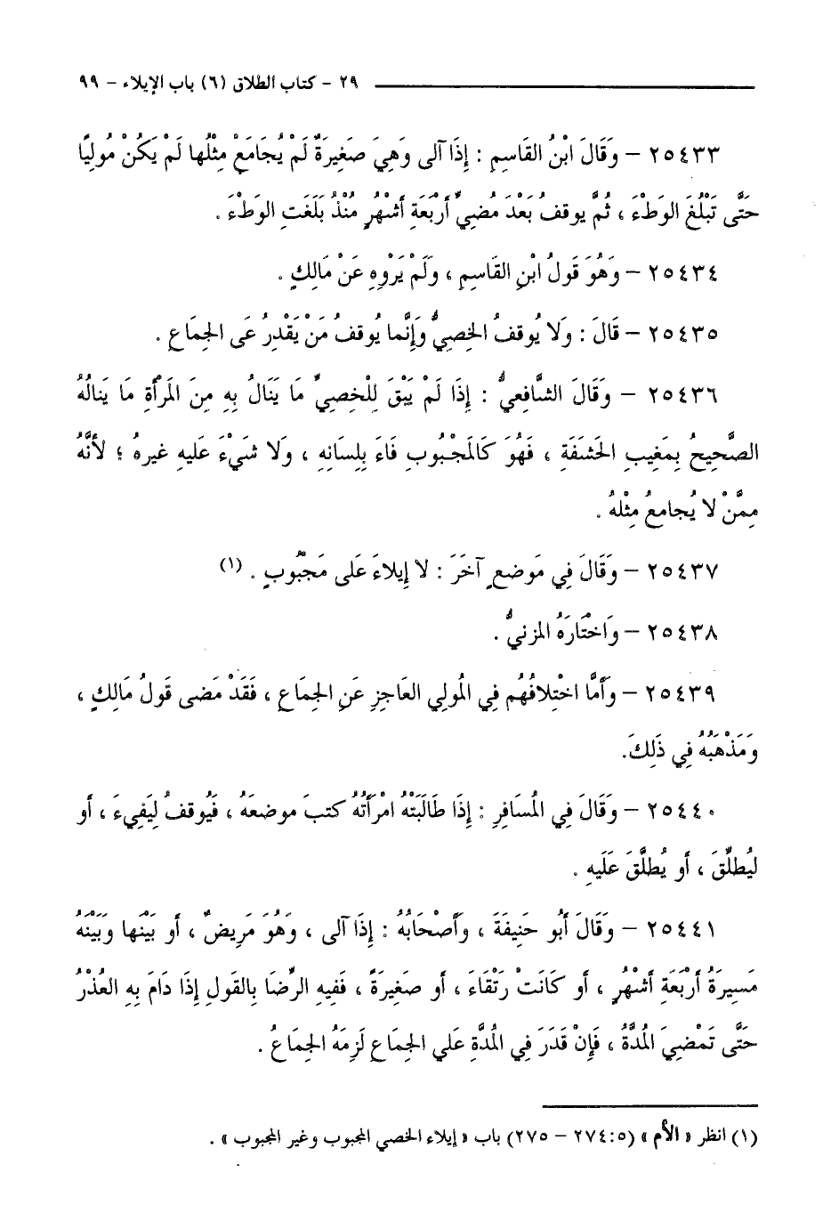 25435 - قَالَ: وَلَا يُوقَفُ الْخَصِيُّ وَإِنَّمَا يُوقَفُ مَنْ يَقْدِرُ عَلَى الْجِمَاعِ.