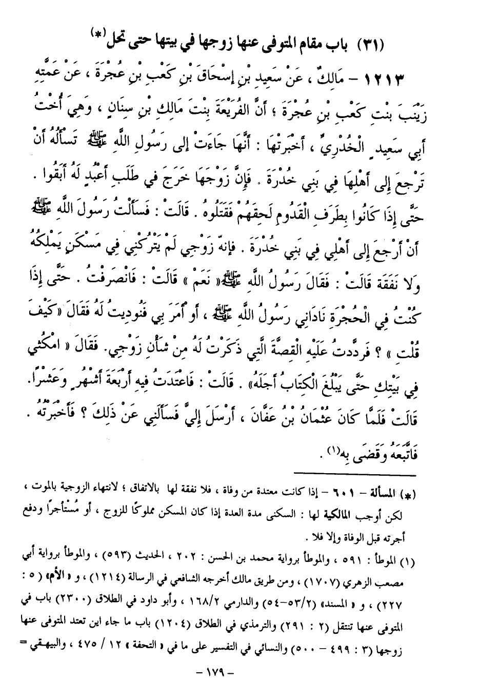 1213 - مَالِكٌ، عَنْ سَعِيدِ بْنِ إِسْحَاقَ بْنِ كَعْبِ بْنِ عُجْرَةَ، عَنْ عَمَّتِهِ زَيْنَبَ بِنْتِ كَعْبِ بْنِ عُجْرَةَ ;أَنَّ الْفُرَيْعَةَ بِنْتَ مَالِكِ بْنِ سِنَانٍ، وَهِيَ أُخْتُ أَبِي سَعِيدٍ الْخُدْرِيِّ، أَخْبَرَتْهَا: أَنَّهَا جَاءَتْ إِلَى رَسُولِ اللَّهِ - صَلَّى اللَّهُ عَلَيْهِ وَسَلَّمَ - تَسْأَلُهُ أَنْ تَرْجِعَ إِلَى أَهْلِهَا فِي بَنِي خُدْرَةَ، فَإِنَّ زَوْجَهَا خَرَجَ فِي طَلَبِ أَعْبُدٍ لَهُ أَبَقُوا، حَتَّى إِذَا كَانُوا بِطَرَفٍ الْقَدُومِ لَحِقَهُمْ فَقَتَلُوهُ. قَالَتْ: فَسَأَلْتُ رَسُولَ اللَّهِ - صَلَّى اللَّهُ عَلَيْهِ وَسَلَّمَ - أَنْ أَرْجِعَ إِلَى أَهْلِي فِي بَنِي خُدْرَةَ، فَإِنَّ زَوْجِي لَمْ يَتْرُكْنِي فِي مَسْكَنٍ يَمْلِكُهُ وَلَا نَفَقَةٍ قَالَتْ: فَقَالَ رَسُولُ اللَّهِ - صَلَّى اللَّهُ عَلَيْهِ وَسَلَّمَ - " نَعَمْ " قَالَتْ: فَانْصَرَفْتُ. حَتَّى إِذَا كُنْتُ فِي الْحُجْرَةِ نَادَانِي رَسُولُ اللَّهِ - صَلَّى اللَّهُ عَلَيْهِ وَسَلَّمَ - أَوْ أَمَرَ بِي فَنُودِيتُ لَهُ فَقَالَ: " كَيْفَ قُلْتِ ؟ " فَرَدَدْتُ عَلَيْهِ الْقِصَّةَ الَّتِي ذَكَرْتُ لَهُ مِنْ شَأْنِ زَوْجِي، فَقَالَ: " امْكُثِي فِي بَيْتِكِ حَتَّى يَبْلُغَ الْكِتَابُ أَجْلَهَ ". قَالَتْ: فَاعْتَدَدْتُ فِيهِ أَرْبَعَةَ أَشْهُرٍ وَعَشْرًا، قَالَتْ: فَلَمَّا كَانَ عُثْمَانُ بْنُ عَفَّانَ، أَرْسَلَ إِلَيَّ فَسَأَلَنِي عَنْ ذَلِكَ ؟ فَأَخْبَرَتْهُ. فَاتَّبَعَهُ وَقَضَى بِهِ.
