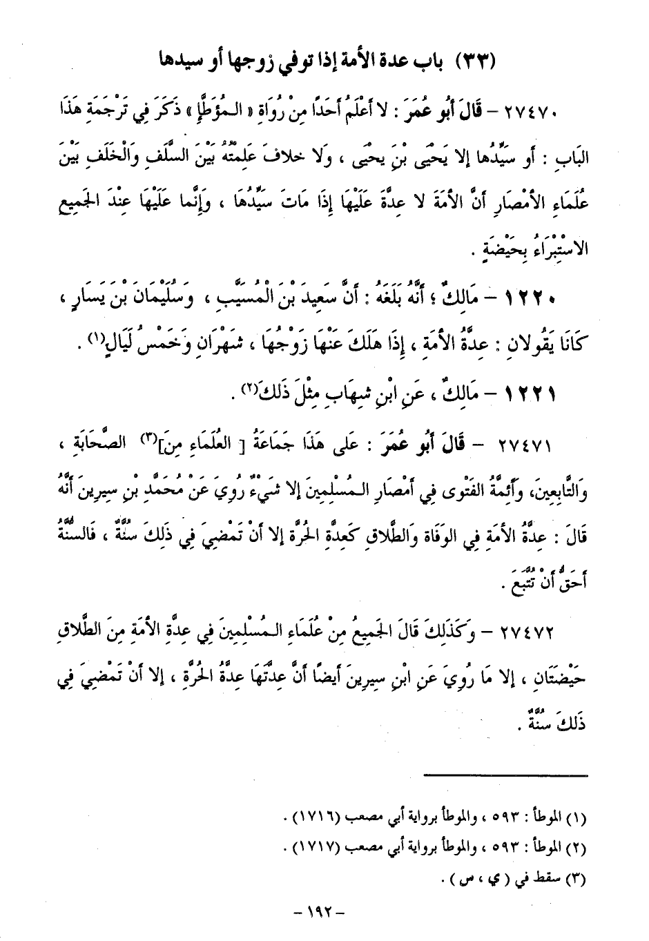 27470 - قَالَ أَبُو عُمَرَ: لَا أَعْلَمُ أَحَدًا مِنْ رُوَاةِ " الْمُوَطَّأِ " ذَكَرَ فِي تَرْجَمَةِ هَذَا الْبَابِ: أَوْ سَيِّدُهَا إِلَا يَحْيَى بْنَ يَحْيَى، وَلَا خِلَافَ عَلِمْتُهُ بَيْنَ السَّلَفِ وَالْخَلَفِ بَيْنَ عُلَمَاءِ الْأَمْصَارِ أَنَّ الْأَمَةَ لَا عِدَّةَ عَلَيْهَا إِذَا مَاتَ سَيِّدُهَا، وَإِنَّمَا عَلَيْهَا عِنْدَ الْجَمِيعِ الِاسْتِبْرَاءُ بِحَيْضَةٍ.