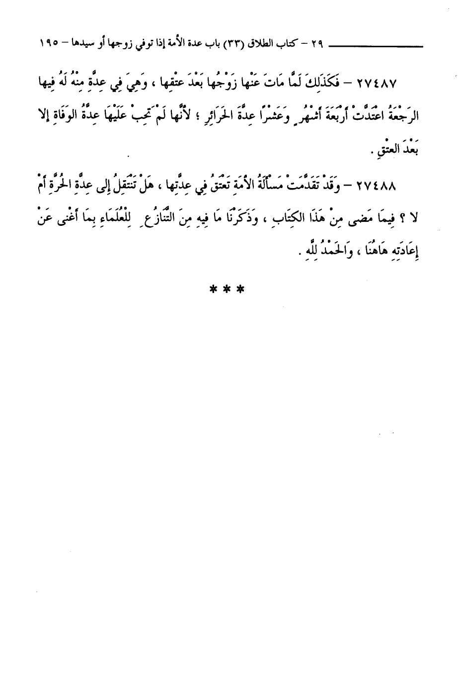 27488 - وَقَدْ تَقَدَّمَتْ مَسْأَلَةُ الْأَمَةِ تُعْتَقُ فِي عِدَّتِهَا، هَلْ تَنْتَقِلُ إِلَى عِدَّةِ الْحُرَّةِ، أَمْ لَا ؟ فِيمَا مَضَى مِنْ هَذَا الْكِتَابِ، وَذَكَرْنَا مَا فِيهِ مِنَ التَّنَازُعِ لِلْعُلَمَاءِ بِمَا أَغْنَى عَنْ إِعَادَتِهَا هَاهُنَا، وَالْحَمْدُ لِلَّهِ.
