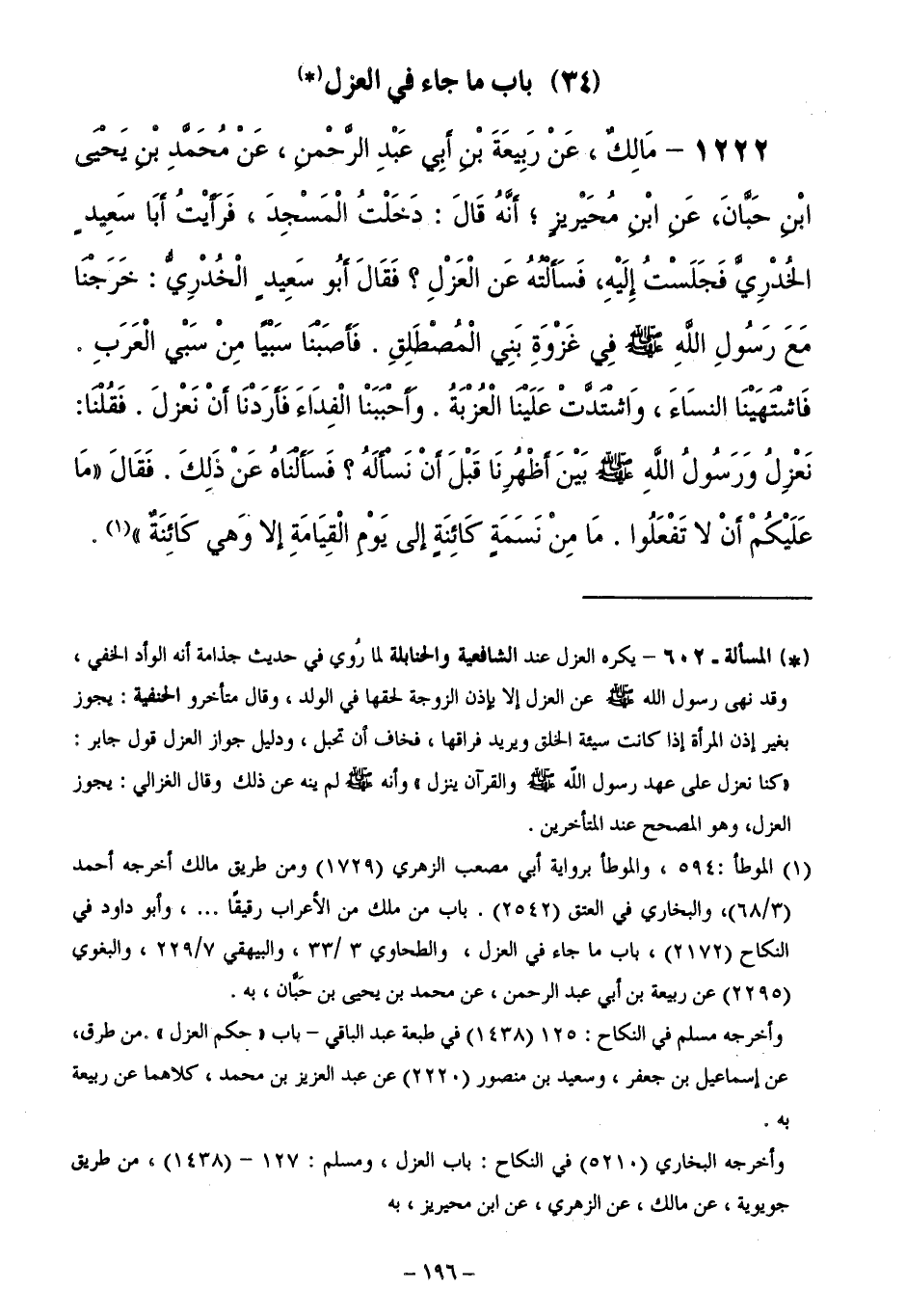 1222 - مَالِكٌ، عَنْ رَبِيعَةَ بْنِ أَبِي عَبْدِ الرَّحْمَنِ، عَنْ مُحَمَّدِ بْنِ يَحْيَى بْنِ حَبَّانَ،عَنِ ابْنِ مُحَيْرِيزٍ ; أَنَّهُ قَالَ: دَخَلْتُ الْمَسْجِدَ، فَرَأَيْتُ أَبَا سَعِيدٍ الْخُدْرِيَّ فَجَلَسْتُ إِلَيْهِ، فَسَأَلْتُهُ عَنِ الْعَزْلِ ؟ فَقَالَ أَبُو سَعِيدٍ الْخُدْرِيُّ: خَرَجْنَا مَعَ رَسُولِ اللَّهِ - صَلَّى اللَّهُ عَلَيْهِ وَسَلَّمَ - فِي غَزْوَةِ بَنِي الْمُصْطَلِقِ. فَأَصَبْنَا سَبْيًا مِنْ سَبْيِ الْعَرَبِ. فَاشْتَهَيْنَا النِّسَاءَ. وَاشْتَدَّتْ عَلَيْنَا الْعُزْبَةُ، وَأَحْبَبْنَا الْفِدَاءَ فَأَرَدْنَا أَنْ نَعْزِلَ. فَقُلْنَا: نَعْزِلُ وَرَسُولُ اللَّهِ - صَلَّى اللَّهُ عَلَيْهِ وَسَلَّمَ - بَيْنَ أَظْهُرِنَا قَبْلَ أَنْ نَسْأَلَهُ ؟ فَسَأَلْنَاهُ عَنْ ذَلِكَ. فَقَالَ: " مَا عَلَيْكُمْ أَنْ لَا تَفْعَلُوا مَا مِنْ نَسَمَةٍ كَائِنَةٍ إِلَى يَوْمِ الْقِيَامَةِ إِلَّا وَهِيَ كَائِنَةٌ ".