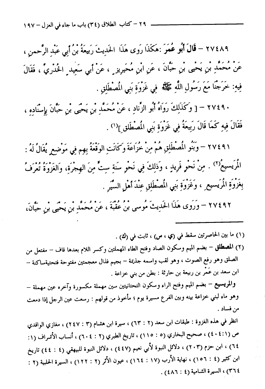 27489 - قَالَ أَبُو عُمَرَ: هَكَذَا رَوَى هَذَا الْحَدِيثَ رَبِيعَةُ بْنُ أَبِي عَبْدِ الرَّحْمَنِ، عَنْ مُحَمَّدِ بْنِ يَحْيَى بْنِ حَبَّانَ، عَنِ ابْنِ مُحَيْرِيزٍ، عَنْ أَبِي سَعِيدٍ الْخُدْرِيِّ، فَقَالَ فِيهِ: خَرَجْنَا مَعَ رَسُولِ اللَّهِ - صَلَّى اللَّهُ عَلَيْهِ وَسَلَّمَ - فِي غَزْوَةِ بَنِي الْمُصْطَلِقِ.