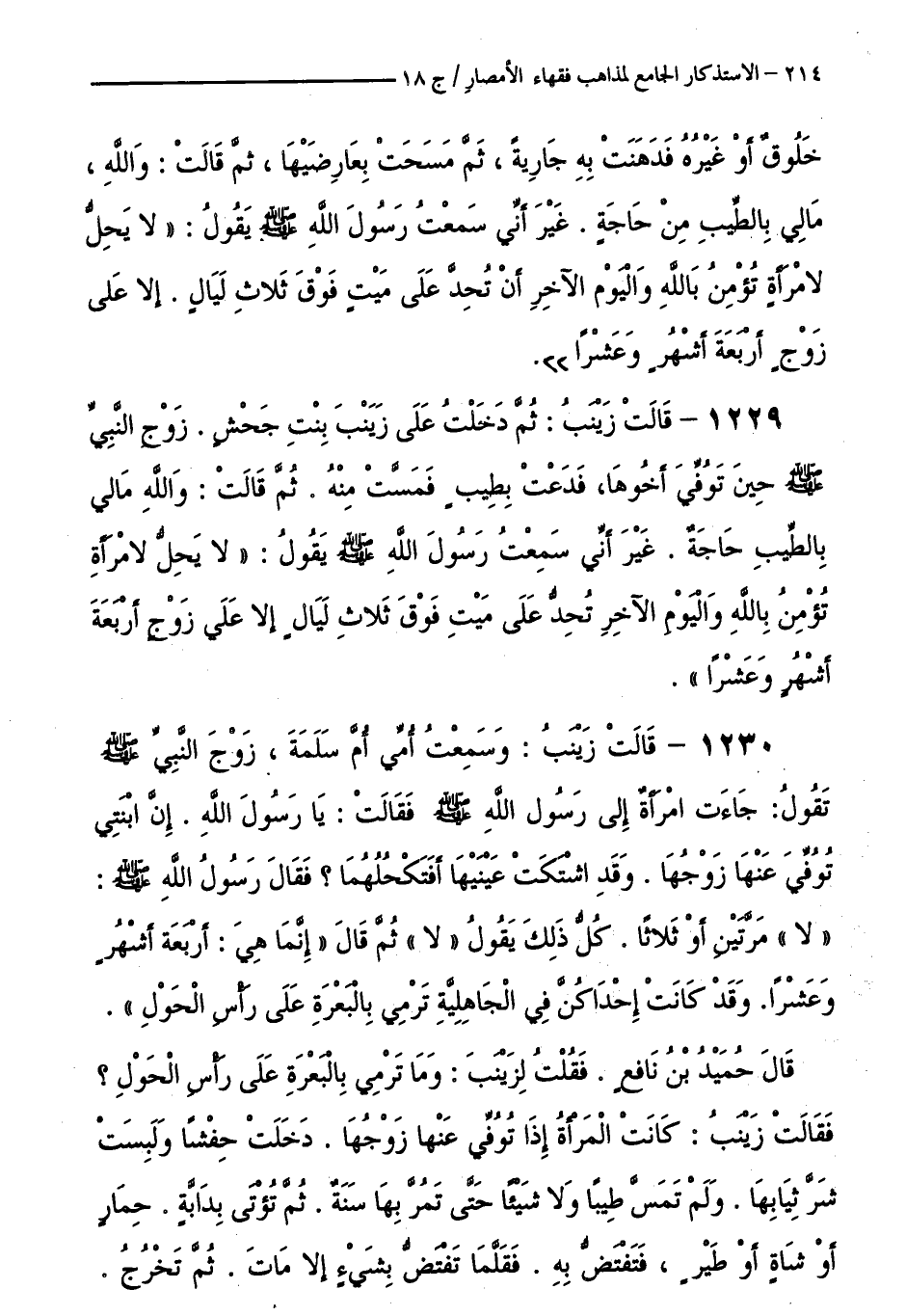 1229 - قَالَتْ زَيْنَبُ: ثُمَّ دَخَلْتُ عَلَى زَيْنَبَ بِنْتِ جَحْشٍ، زَوْجِ النَّبِيِّ - صَلَّى اللَّهُ عَلَيْهِ وَسَلَّمَ - حِينَ تُوُفِّيَ أَخُوهَا، فَدَعَتْ بِطِيبٍ فَمَسَّتْ مِنْهُ. ثُمَّ قَالَتْ: وَاللَّهِ مَا لِي بِالطِّيبِ حَاجَةٌ. غَيْرَ أَنِّي سَمِعْتُ رَسُولَ اللَّهِ - صَلَّى اللَّهُ عَلَيْهِ وَسَلَّمَ - يَقُولُ: " لَا يَحِلُّ لِامْرَأَةٍ تُؤْمِنُ بِاللَّهِ وَالْيَوْمِ الْآخِرِ تُحِدُّ عَلَى مَيِّتٍ فَوْقَ ثَلَاثِ لَيَالٍ، إِلَّا عَلَى زَوْجٍ أَرْبَعَةَ أَشْهُرٍ وَعَشْرًا ".
