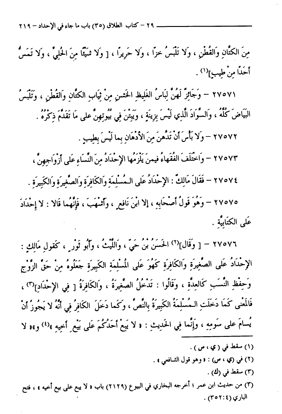 27576 - وَقَالَ الْحَسَنُ بْنُ حَيٍّ وَاللَّيْثُ، وَأَبُو ثَوْرٍ، كَقَوْلِ مَالِكٍ: الْإِحْدَادُ عَلَى الصَّغِيرَةِ، وَالْكَافِرَةِ، كَهُوَ عَلَى الْمُسْلِمَةِ الْكَبِيرَةِ جَعَلُوهُ مِنْ حَقِّ الزَّوْجِ، وَحَفِظِ النَّسَبَ كَالْعِدَّةِ، وَقَالُوا: تَدْخُلُ الصَّغِيرَةُ، وَالْكَافِرَةُ فِي الْإِحْدَادِ، فَالْمَعْنَى كَمَا دَخَلَتِ الْمُسْلِمَةُ الْكَبِيرَةُ بِالنَّصِّ، وَكَمَا دَخَلَ الْكَافِرُ فِي أَنَّهُ لَا يَجُوزُ أَنْ يُسَامَ عَلَى سَوْمِهِ، وَإِنَّمَا فِي الْحَدِيثِ: "لَا يَبِعْ أَحَدُكُمْ عَلَى بَيْعِ أَخِيهِ " وَ " لَا