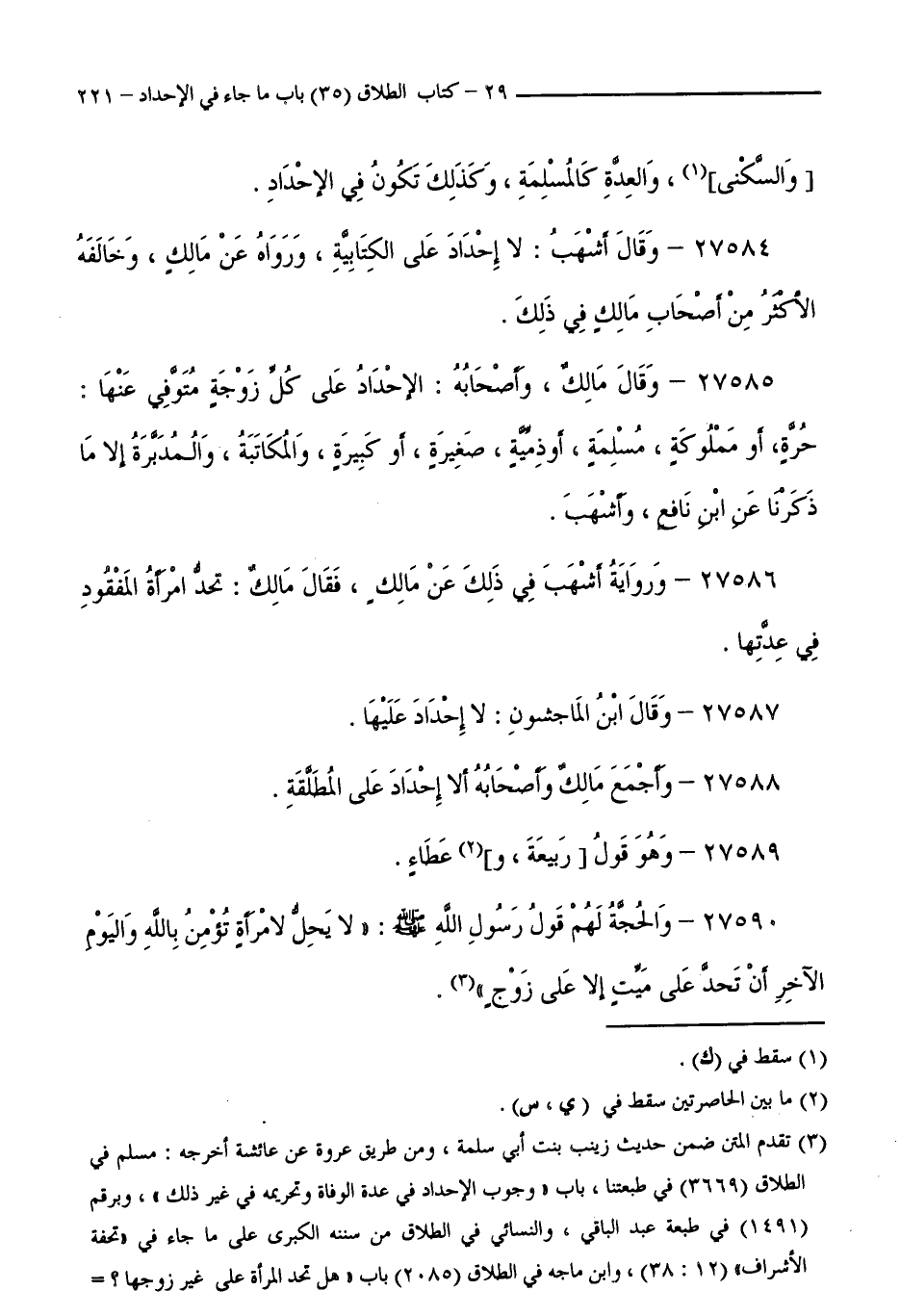 27590 - وَالْحُجَّةُ لَهُمْ قَوْلُ رَسُولِ اللَّهِ - صَلَّى اللَّهُ عَلَيْهِ وَسَلَّمَ -: "لَا يَحِلُّ لِامْرَأَةٍ تُؤْمِنُ بِاللَّهِ وَالْيَوْمِ الْآخِرِ أَنْ تُحِدَّ عَلَى مَيِّتٍ إِلَّا عَلَى زَوْجٍ ".