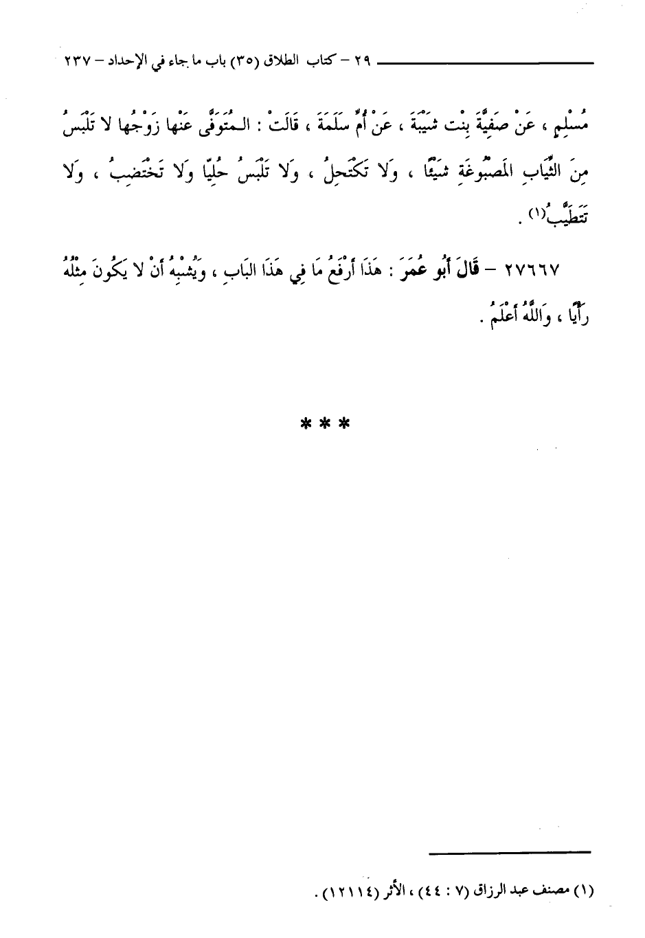 مُسْلِمٍ، عَنْ صَفِيَّةَ بِنْتِ شَيْبَةَ، عَنْ أُمِّ سَلَمَةَ، قَالَتْ: الْمُتَوَفَّى عَنْهَا زَوْجُهَا لَا تَلْبَسُ مِنَ الثِّيَابِ الْمَصْبُوغَةِ شَيْئًا، وَلَا تَكْتَحِلُ، وَلَا تَلْبَسُ حُلِيًّا، وَلَا تَخْتَضِبُ، وَلَا تَتَطَيَّبُ.