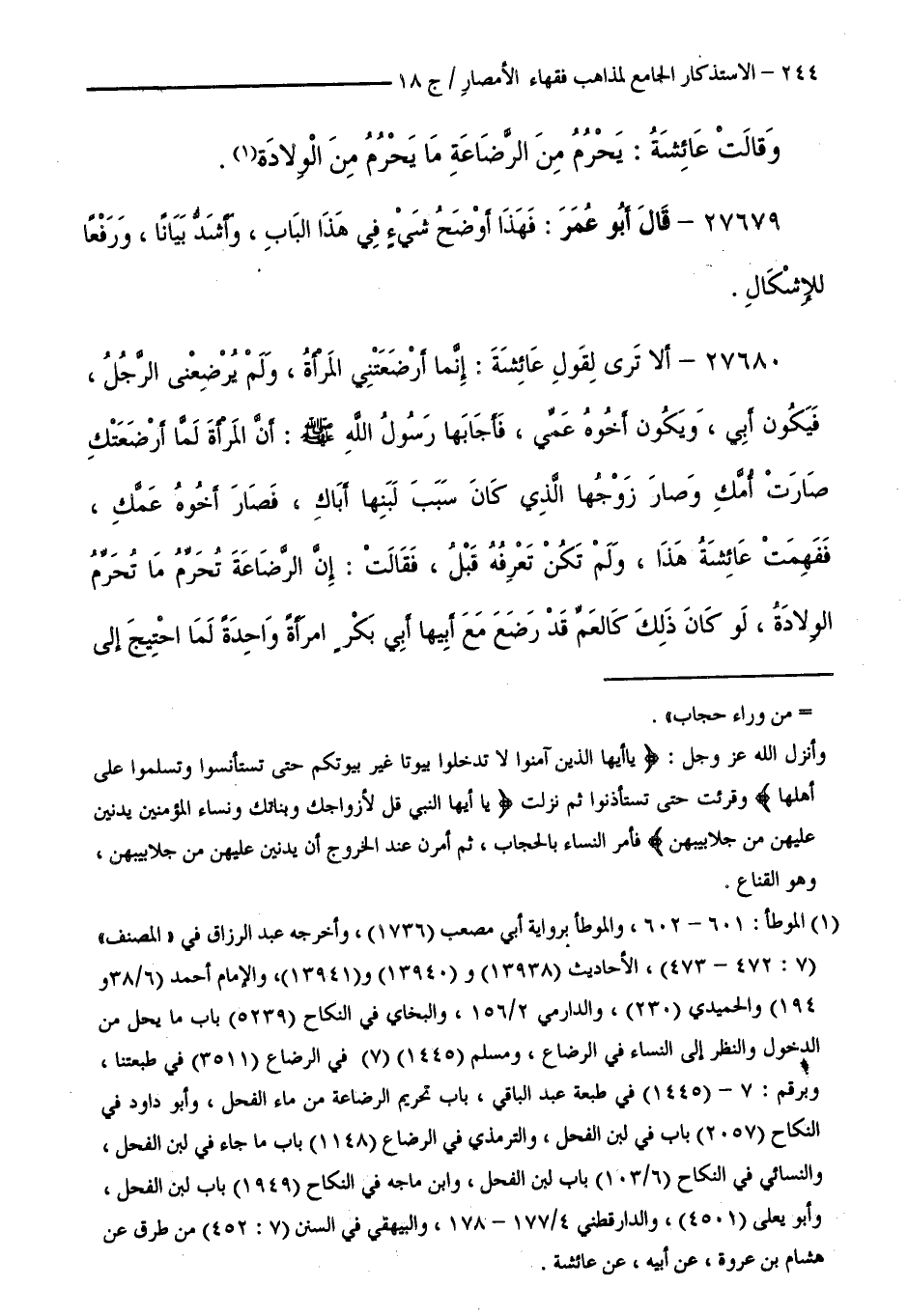 27680 - أَلَا تَرَى لِقَوْلِ عَائِشَةَ: إِنَّمَا أَرْضَعَتْنِي الْمَرْأَةُ، وَلَمْ يُرْضِعْنِي الرَّجُلُ، فَيَكُونُ أَبِي، وَيَكُونُ أَخُوهُ عَمِّي، فَأَجَابَهَا رَسُولُ اللَّهِ - صَلَّى اللَّهُ عَلَيْهِ وَسَلَّمَ -: أَنَّ الْمَرْأَةَ لَمَّا أَرْضَعَتْكِ صَارَتْ أُمَّكِ وَصَارَ زَوْجُهَا الَّذِي كَانَ سَبَبَ لَبَنِهَا أَبَاكِ، فَصَارَ أَخُوهُ عَمَّكِ، فَفَهِمَتْ عَائِشَةُ هَذَا، وَلَمْ تَكُنْ تَعَرِفُهُ قَبْلُ، فَقَالَتْ: إِنَّ الرَّضَاعَةَ تُحَرِّمُ مَا تُحَرِّمُ الْوِلَادَةُ، لَوْ كَانَ ذَلِكَ كَالْعَمِّ قَدْ رَضَعَ مَعَ أَبِيهَا أَبِي بَكْرٍ امْرَأَةً وَاحِدَةً لَمَا احْتِيجَ إِلَى