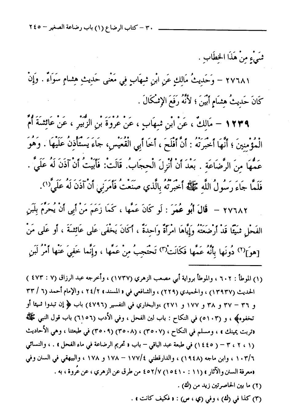 1239 - مَالِكٌ، عَنِ ابْنِ شِهَابٍ، عَنْ عُرْوَةَ بْنِ الزُّبَيْرِ،عَنْ عَائِشَةَ أُمِّ الْمُؤْمِنِينَ ; أَنَّهَا أَخْبَرَتْهُ، أَنْ أَفْلَحَ أَخَا أَبِي الْقُعَيْسِ، جَاءَ يَسْتَأْذِنُ عَلَيْهَا وَهُوَ عَمُّهَا مِنَ الرَّضَاعَةِ بَعْدَ أَنْ أُنْزِلَ الْحِجَابُ. قَالَتْ: فَأَبَيْتُ أَنْ آذَنَ لَهُ عَلَيَّ. فَلَمَّا جَاءَ رَسُولُ اللَّهِ - صَلَّى اللَّهُ عَلَيْهِ وَسَلَّمَ - أَخْبَرْتُهُ بِالَّذِي صَنَعْتُ فَأَمَرَنِي أَنْ آذَنَ لَهُ عَلَيَّ.