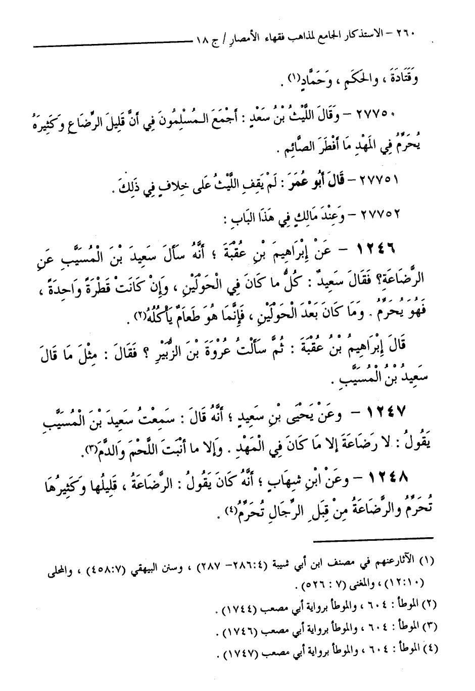 27752 - وَعِنْدَ مَالِكٍ فِي هَذَا الْبَابِ 1246 - عَنْ إِبْرَاهِيمَ بْنِ عُقْبَةَ ; أَنَّهُ سَأَلَ سَعِيدَ بْنَ الْمُسَيِّبِ عَنِ الرَّضَاعَةِ ؟ فَقَالَ سَعِيدٌ: كُلُّ مَا كَانَ فِي الْحَوْلَيْنِ، وَإِنْ كَانَتْ قَطْرَةً وَاحِدَةً، فَهُوَ يُحَرِّمُ. وَمَا كَانَ بَعْدَ الْحَوْلَيْنِ، فَإِنَّمَا هُوَ طَعَامٌ يَأْكُلُهُ.