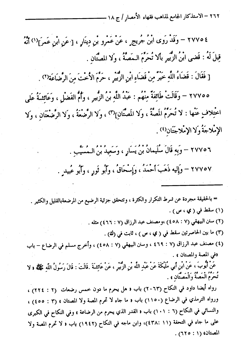 27755 - وَقَالَتْ طَائِفَةٌ مِنْهُمْ: عَبْدُ اللَّهِ بْنُ الزُّبَيْرِ، وَأُمُّ الْفَضْلِ، وَعَائِشَةُ عَلَى اخْتِلَافٍ عَنْهَا: لَا تُحَرِّمُ الْمَصَّةُ، وَلَا الْمَصَّتَانِ، وَلَا الرَّضْعَةُ، وَلَا الرَّضْعَتَانِ، وَلَا الْإِمْلَاجَةُ، وَلَا الْإِمْلَاجَتَانِ.