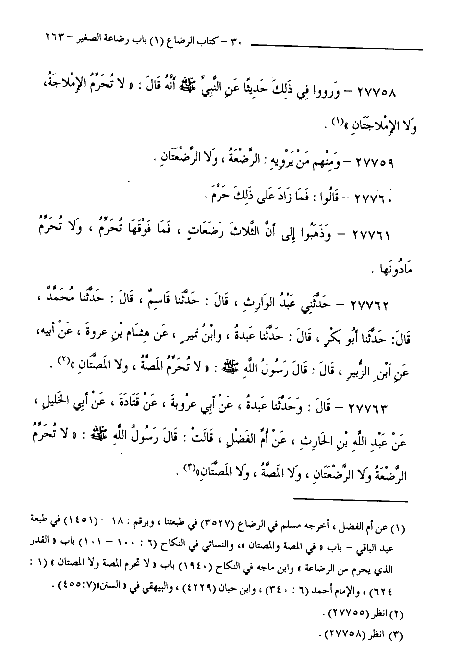 27763 - قَالَ: وَحَدَّثَنَا عَبْدَةُ، عَنْ أَبِي عَرُوبَةَ، عَنْ قَتَادَةَ، عَنْ أَبِي الْخَلِيلِ، عَنْ عَبْدِ اللَّهِ بْنِ الْحَارِثِ، عَنْ أُمِّ الْفَضْلِ، قَالَتْ: قَالَ رَسُولُ اللَّهِ - صَلَّى اللَّهُ عَلَيْهِ وَسَلَّمَ -: "لَا تُحَرِّمُ الرَّضْعَةُ وَلَا الرَّضْعَتَانِ، وَلَا الْمَصَّةُ وَلَا الْمَصَّتَانِ ".