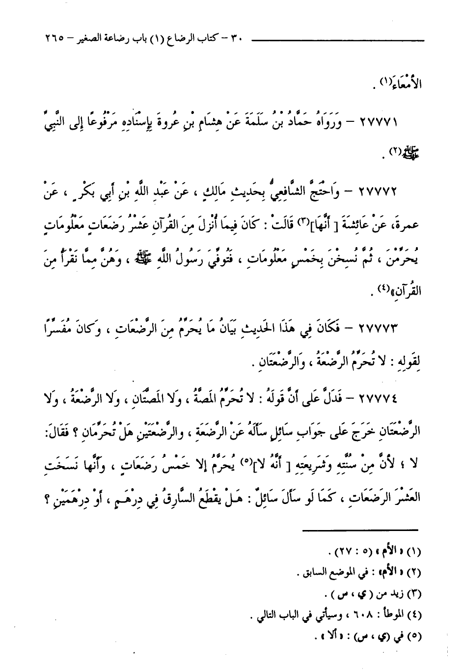 27772 - وَاحْتَجَّ الشَّافِعِيُّ بِحَدِيثِ مَالِكٍ، عَنْ عَبْدِ اللَّهِ بْنِ أَبِي بَكْرٍ، عَنْ عَمْرَةَ، عَنْ عَائِشَةَ أَنَّهَا قَالَتْ: كَانَ فِيمَا أُنْزِلَ مِنَ الْقُرْآنِ عَشْرُ رَضَعَاتٍ مَعْلُومَاتٍ يُحَرِّمْنَ، ثُمَّ نُسِخْنَ بِخَمْسٍ مَعْلُومَاتٍ، فَتُوُفِّيَ رَسُولُ اللَّهِ - صَلَّى اللَّهُ عَلَيْهِ وَسَلَّمَ - وَهُنَّ مِمَّا نَقْرَأُ مِنَ الْقُرْآنِ ".