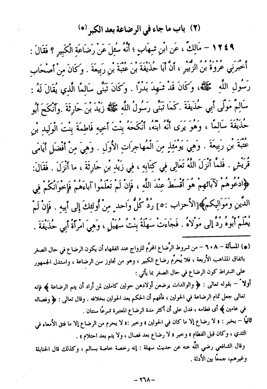 1249 - مَالِكٌ، عَنِ ابْنِ شِهَابٍ ; أَنَّهُ سُئِلَ عَنْ رَضَاعَةِ الْكَبِيرِ ؟ فَقَالَ:أَخْبَرَنِي عُرْوَةُ بْنُ الزُّبَيْرِ، أَنَّ أَبَا حُذَيْفَةَ بْنَ عُتْبَةَ بْنِ رَبِيعَةَ، وَكَانَ مِنْ أَصْحَابِ رَسُولِ اللَّهِ - صَلَّى اللَّهُ عَلَيْهِ وَسَلَّمَ - وَكَانَ قَدْ شَهِدَ بَدْرًا، وَكَانَ تَبَنَّى سَالِمًا الَّذِي يُقَالُ لَهُ: سَالِمٌ مَوْلَى أَبِي حُذَيْفَةَ. كَمَا تَبَنَّى رَسُولُ اللَّهِ - صَلَّى اللَّهُ عَلَيْهِ وَسَلَّمَ - زَيْدَ بْنَ حَارِثَةَ، وَأَنْكَحَ أَبُو حُذَيْفَةَ سَالِمًا، وَهُوَ يَرَى أَنَّهُ ابْنُهُ، أَنْكَحَهُ بِنْتَ أَخِيهِ فَاطِمَةَ بِنْتَ الْوَلِيدِ بْنِ عُتْبَةَ بْنِ رَبِيعَةَ. وَهِيَ يَوْمَئِذٍ مِنَ الْمُهَاجِرَاتِ الْأُوَلِ، وَهِيَ مِنْ أَفْضَلِ أَيَامَى قُرَيْشٍ، فَلَمَّا أَنْزَلَ اللَّهُ تَعَالَى فِي كِتَابِهِ، وَفِي زَيْدِ بْنِ حَارِثَةَ مَا أَنْزَلَ، فَقَالَ:ادْعُوهُمْ لِآبَائِهِمْ هُوَ أَقْسَطُ عِنْدَ اللَّهِ فَإِنْ لَمْ تَعْلَمُوا آبَاءَهُمْ فَإِخْوَانُكُمْ فِي الدِّينِ وَمَوَالِيكُمْ [ الْأَحْزَابِ: 5 ] رَدَّ كُلُّ وَاحِدٍ مِنْ أُولَئِكَ إِلَى أَبِيهِ. فَإِنْ لَمْ يُعْلَمْ أَبُوهُ رُدَّ إِلَى مَوْلَاهُ. فَجَاءَتْ سَهْلَةُ بِنْتُ سُهَيْلٍ. وَهِيَ امْرَأَةُ أَبِي حُذَيْفَةَ.