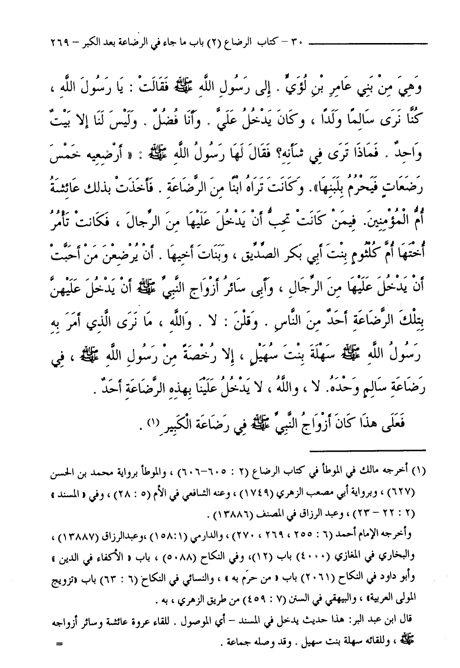 وَهِيَ مِنْ بَنِي عَامِرِ بْنِ لُؤَيٍّ. إِلَى رَسُولِ اللَّهِ - صَلَّى اللَّهُ عَلَيْهِ وَسَلَّمَ - فَقَالَتْ: يَا رَسُولَ اللَّهِ، كُنَّا نَرَى سَالِمًا وَلَدًا، وَكَانَ يَدْخُلُ عَلَيَّ. وَأَنَا فُضُلٌ. وَلَيْسَ لَنَا إِلَّا بَيْتٌ وَاحِدٌ. فَمَاذَا تَرَى فِي شَأْنِهِ ؟ فَقَالَ لَهَا رَسُولُ اللَّهِ - صَلَّى اللَّهُ عَلَيْهِ وَسَلَّمَ -: " أَرَضِعَيْهِ خَمْسَ رَضَعَاتٍ فَيَحْرُمُ بِلَبَنِهَا ". وَكَانَتْ تَرَاهُ ابْنًا مِنَ الرَّضَاعَةِ. فَأَخَذَتْ بِذَلِكَ عَائِشَةُ أُمُّ الْمُؤْمِنِينَ. فِيمَنْ كَانَتْ تُحِبُّ أَنْ يَدْخُلَ عَلَيْهَا مِنَ الرِّجَالِ، فَكَانَتْ تَأْمُرُ أُخْتَهَا أُمَّ كُلْثُومِ بِنْتَ أَبِي بَكْرٍ الصَّدِيقِ، وَبَنَاتِ أَخِيهَا. أَنْ يُرْضِعْنَ مَنْ أَحَبَّتْ أَنْ يَدْخُلَ عَلَيْهَا مِنَ الرِّجَالِ، وَأَبَى سَائِرُ أَزْوَاجِ النَّبِيِّ - صَلَّى اللَّهُ عَلَيْهِ وَسَلَّمَ - أَنْ يَدْخُلَ عَلَيْهِنَّ بِتِلْكَ الرَّضَاعَةِ أَحَدٌ مِنَ النَّاسِ، وَقُلْنَ: لَا وَاللَّهِ، مَا نَرَى الَّذِي أَمَرَ بِهِ رَسُولُ اللَّهِ - صَلَّى اللَّهُ عَلَيْهِ وَسَلَّمَ - سَهْلَةَ بِنْتَ سُهَيْلٍ. إِلَّا رُخْصَةً مِنْ رَسُولِ اللَّهِ - صَلَّى اللَّهُ عَلَيْهِ وَسَلَّمَ - فِي رَضَاعَةِ سَالِمٍ وَحْدَهُ، لَا وَاللَّهِ، لَا يَدْخُلُ عَلَيْنَا بِهَذِهِ الرَّضَاعَةِ أَحَدٌ.