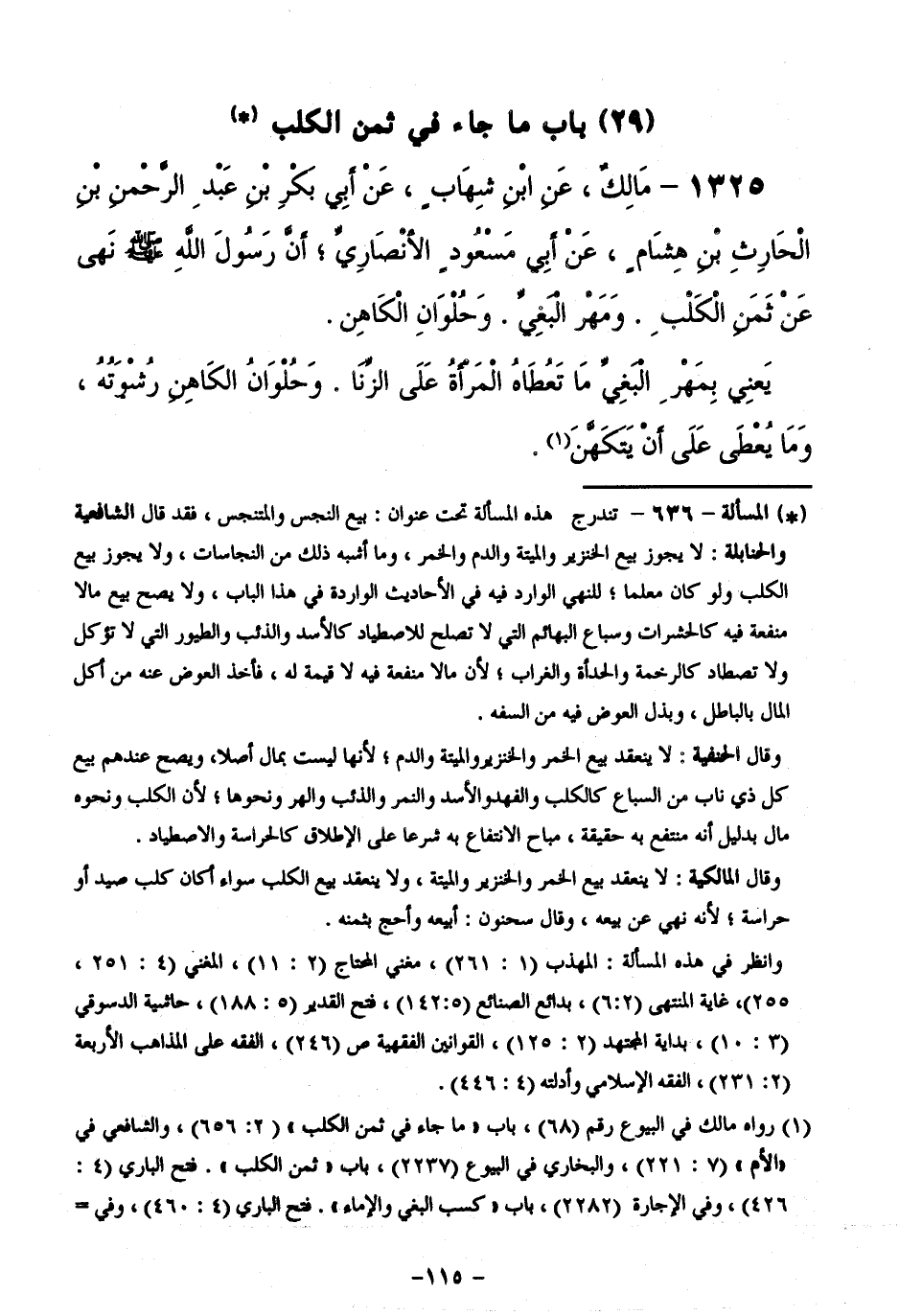 1325 - مَالِكٌ، عَنِ ابْنِ شِهَابٍ، عَنْ أَبِي بَكْرِ بْنِ عَبْدِ الرَّحْمَنِ بْنِ الْحَارِثِ بْنِ هِشَامٍ، عَنْ أَبِي مَسْعُودٍ الْأَنْصَارِيِّ،أَنَّ رَسُولَ اللَّهِ صَلَّى اللَّهُ عَلَيْهِ وَسَلَّمَ نَهَى عَنْ ثَمَنِ الْكَلْبِ. وَمَهْرِ الْبَغِيِّ، وَحُلْوَانِ الْكَاهِنِ.
