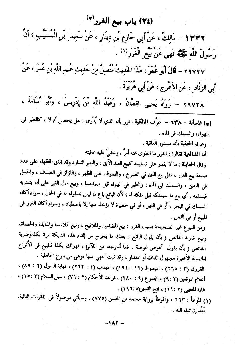 1332 - مَالِكٌ، عَنْ أَبِي حَازِمِ بْنِ دِينَارٍ، عَنْ سَعِيدِ بْنِ الْمُسَيَّبِأَنَّ رَسُولَ اللَّهِ صَلَّى اللَّهُ عَلَيْهِ وَسَلَّمَ نَهَى عَنْ بَيْعِ الْغَرَرِ.
