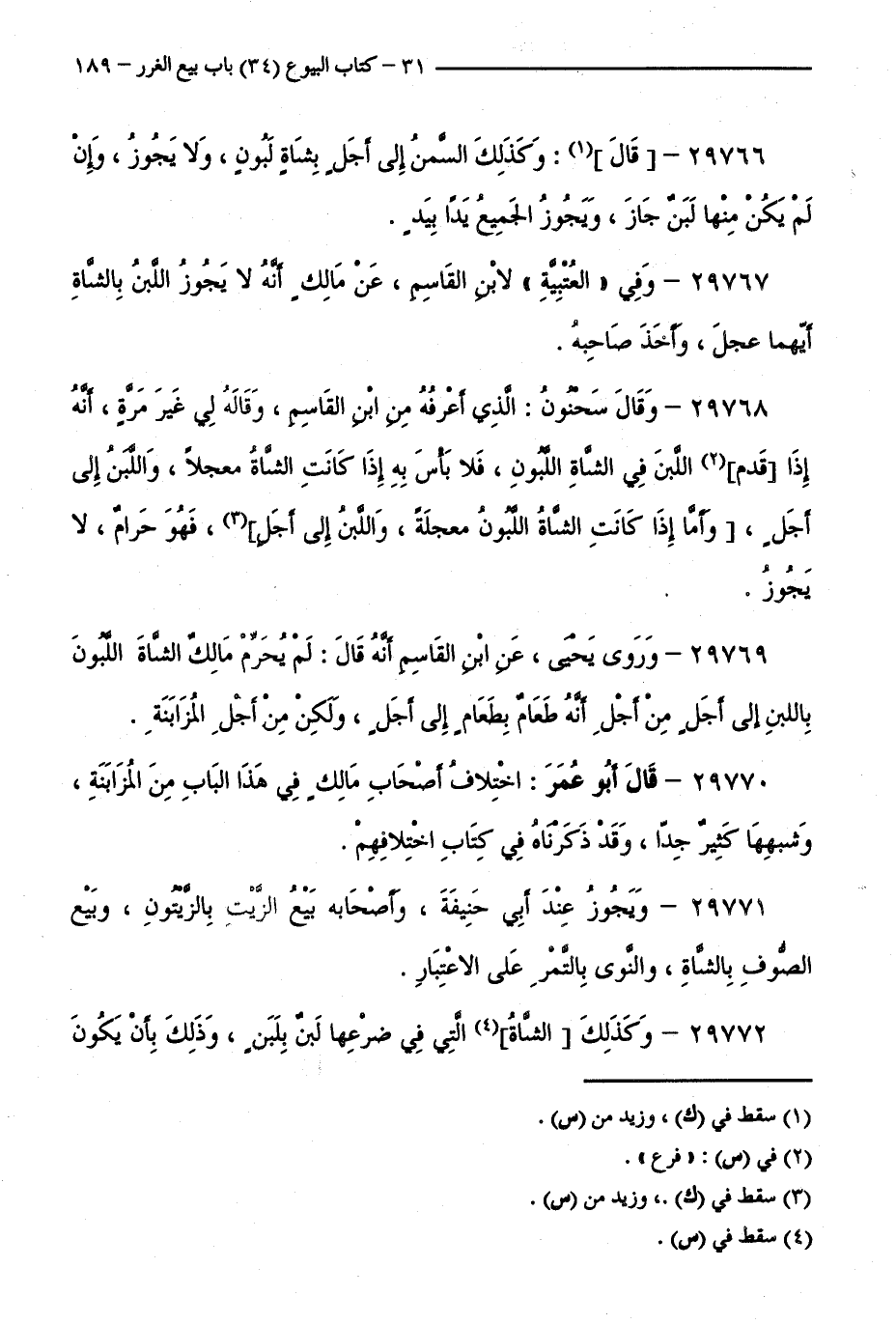 29768 - وَقَالَ سَحْنُونٌ: الَّذِي أَعْرِفُهُ مِنَ ابْنِ الْقَاسِمِ، وَقَالَهُ لِي غَيْرَ مَرَّةٍ، أَنَّهُ إِذَا قَدَّمَ اللَّبَنَ فِي الشَّاةِ اللَّبُونِ، فَلَا بَأْسَ بِهِ إِذَا كَانَتِ الشَّاةُ مُعَجَّلَةً، وَاللَّبَنُ إِلَى أَجَلٍ، وَأَمَّا إِذَا كَانَتِ الشَّاةُ اللَّبُونُ مُعَجَّلَةً، وَاللَّبَنُ إِلَى أَجَلٍ، فَهُوَ حَرَامٌ، لَا يَجُوزُ.