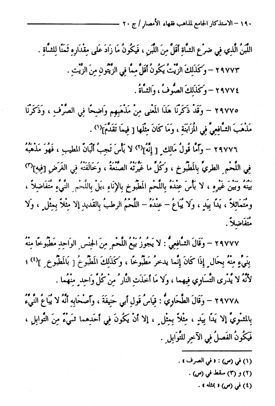 29777 - وَقَالَ الشَّافِعِيُّ: لَا يَجُوزُ بَيْعُ اللَّحْمِ مِنَ الْجِنْسِ الْوَاحِدِ مَطْبُوخًا مِنْهُ بِنَيِّئٍ مِنْهُ بِحَالٍ إِذَا كَانَ إِنَّمَا يُدَّخَرُ مَطْبُوخًا، وَكَذَلِكَ الْمَطْبُوخُ بِالْمَطْبُوخِ، لِأَنَّهُ لَا يُدْرَى التَّسَاوِي فِيهِمَا، وَلَا مَا أَخَذَتِ النَّارُ مِنْ كُلِّ وَاحِدٍ مِنْهُمَا.