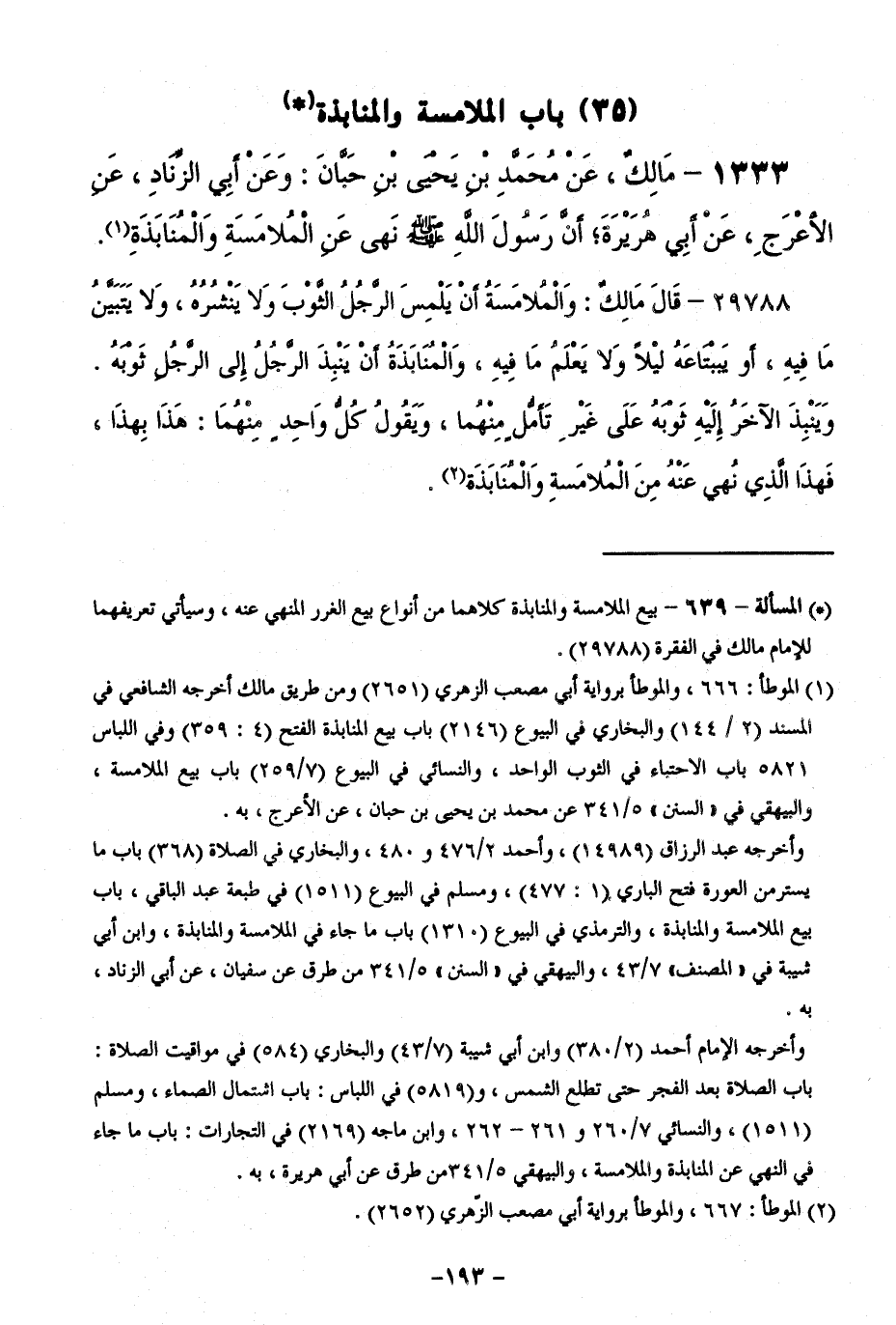 1333 - مَالِكٌ، عَنْ مُحَمَّدِ بْنِ يَحْيَى بْنِ حِبَّانَ: وَعَنْ أَبِي الزِّنَادِ، عَنِ الْأَعْرَجِ، عَنْ أَبِي هُرَيْرَةَ،أَنَّ رَسُولَ اللَّهِ صَلَّى اللَّهُ عَلَيْهِ وَسَلَّمَ نَهَى عَنِ الْمُلَامَسَةِ وَالْمُنَابَذَةِ.