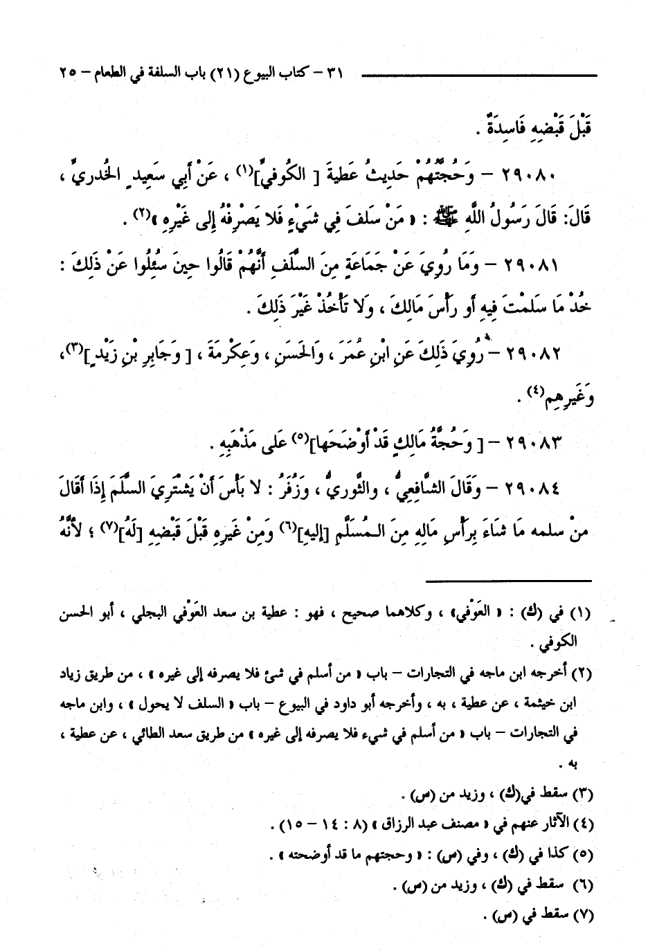 29080 - وَحُجَّتُهُمْ حَدِيثُ عَطِيَّةَ الْكُوفِيِّ، عَنْ أَبِي سَعِيدٍ الْخُدْرِيِّ، قَالَ: قَالَ رَسُولُ اللَّهِ صَلَّى اللَّهُ عَلَيْهِ وَسَلَّمَ: "مَنْ سَلَّفَ فِي شَيْءٍ فَلَا يَصْرِفْهُ إِلَى غَيْرِهِ ".