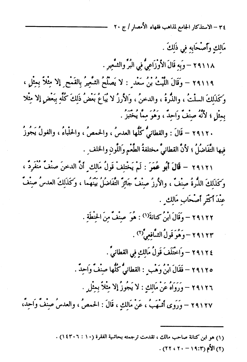 29121 - قَالَ أَبُو عُمَرَ: لَمْ يَخْتَلِفْ قَوْلُ مَالِكٍ أَنَّ الدَّخَنَ صِنْفٌ مُنْفَرِدٌ، وَكَذَلِكَ الذُّرَةُ صِنْفٌ، وَالْأُرْزُ صِنْفٌ جَائِزٌ التَّفَاضُلُ بَيْنَهُمَا، وَكَذَلِكَ الْعَدَسُ صِنْفٌ عِنْدَ أَكْثَرِ أَصْحَابِ مَالِكٍ.