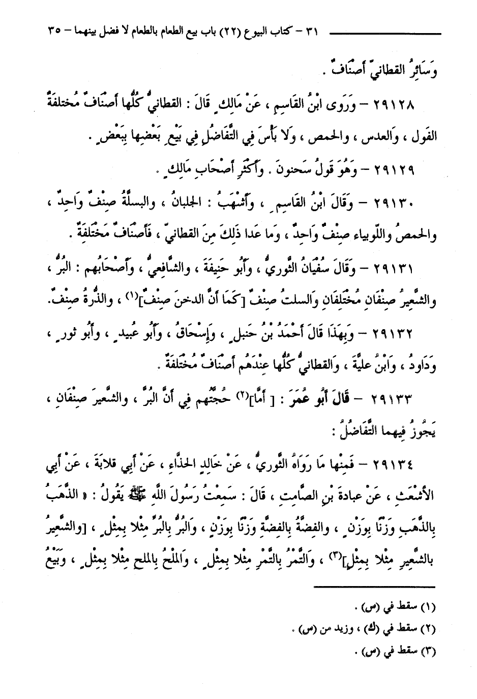 29131 - وَقَالَ سُفْيَانُ الثَّوْرِيُّ، وَأَبُو حَنِيفَةَ، وَالشَّافِعِيُّ، وَأَصْحَابُهُمْ: الْبُرُّ، وَالشَّعِيرُ صِنْفَانِ مُخْتَلِفَانِ وَالسُّلْتُ صِنْفٌ كَمَا أَنَّ الدَّخَنَ صِنْفٌ، وَالذُّرَةُ صِنْفٌ.