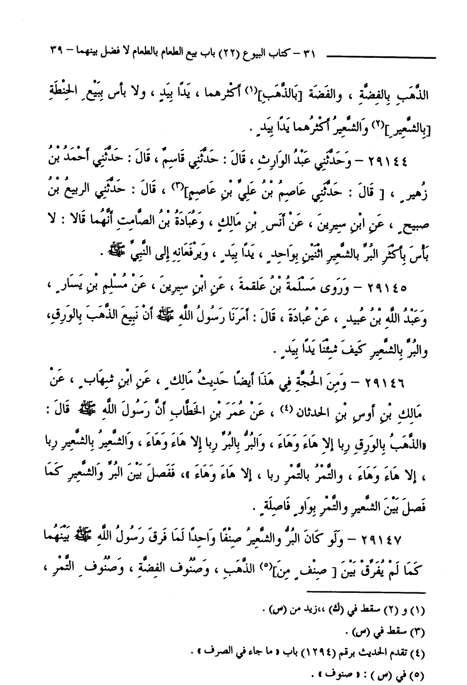 29145 - وَرَوَى مَسْلَمَةُ بْنُ عَلْقَمَةَ عَنِ ابْنِ سِيرِينَ، عَنْ مُسْلِمِ بْنِ يَسَارٍ، وَعَبْدُ اللَّهِ بْنُ عُبَيْدٍ، عَنْ عُبَادَةَ، قَالَأَمَرَنَا رَسُولُ اللَّهِ صَلَّى اللَّهُ عَلَيْهِ وَسَلَّمَ أَنْ نَبِيعَ الذَّهَبَ بِالْوَرِقِ وَالْبُرَّ بِالشَّعِيرِ كَيْفَ شِئْنَا يَدًا بِيَدٍ.