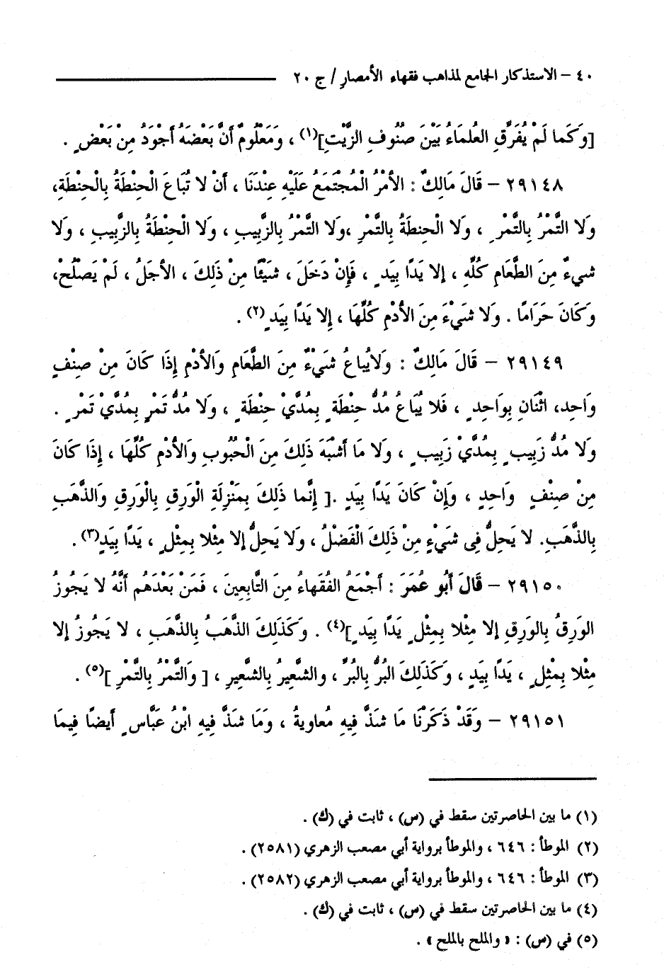 29148 - قَالَ مَالِكٌ: الْأَمْرُ الْمُجْتَمَعُ عَلَيْهِ عِنْدَنَا، أَنْ لَا تُبَاعَ الْحِنْطَةُ بِالْحِنْطَةِ، وَلَا التَّمْرُ بِالتَّمْرِ، وَلَا الْحِنْطَةُ بِالتَّمْرِ، وَلَا التَّمْرُ بِالزَّبِيبِ، وَلَا الْحِنْطَةُ بِالزَّبِيبِ، وَلَا شَيْءَ مِنَ الطَّعَامِ كُلِّهِ، إِلَّا يَدًا بِيَدٍ، فَإِنْ دَخَلَ شَيْئًا مِنْ ذَلِكَ الْأَجَلُ، لَمْ يَصْلُحْ، وَكَانَ حَرَامًا، وَلَا شَيْءَ مِنَ الْأُدْمِ كُلِّهَا، إِلَّا يَدًا بِيَدٍ.