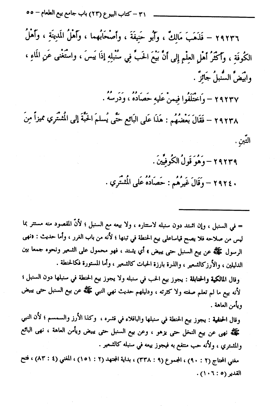 29236 - فَذَهَبَ مَالِكٌ، وَأَبُو حَنِيفَةَ، وَأَصْحَابُهُمَا، وَأَهْلُ الْمَدِينَةِ، وَأَهْلُ الْكُوفَةِ، وَأَكْثَرُ أَهْلِ الْعِلْمِ إِلَى أَنَّ بَيْعَ الْحَبِّ فِي سُنْبُلِهِ إِذْ يَبِسَ، وَاسْتَغْنَى عَنِ الْمَاءِ، وَابْيَضَّ السُّنْبُلُ جَائِزٌ.