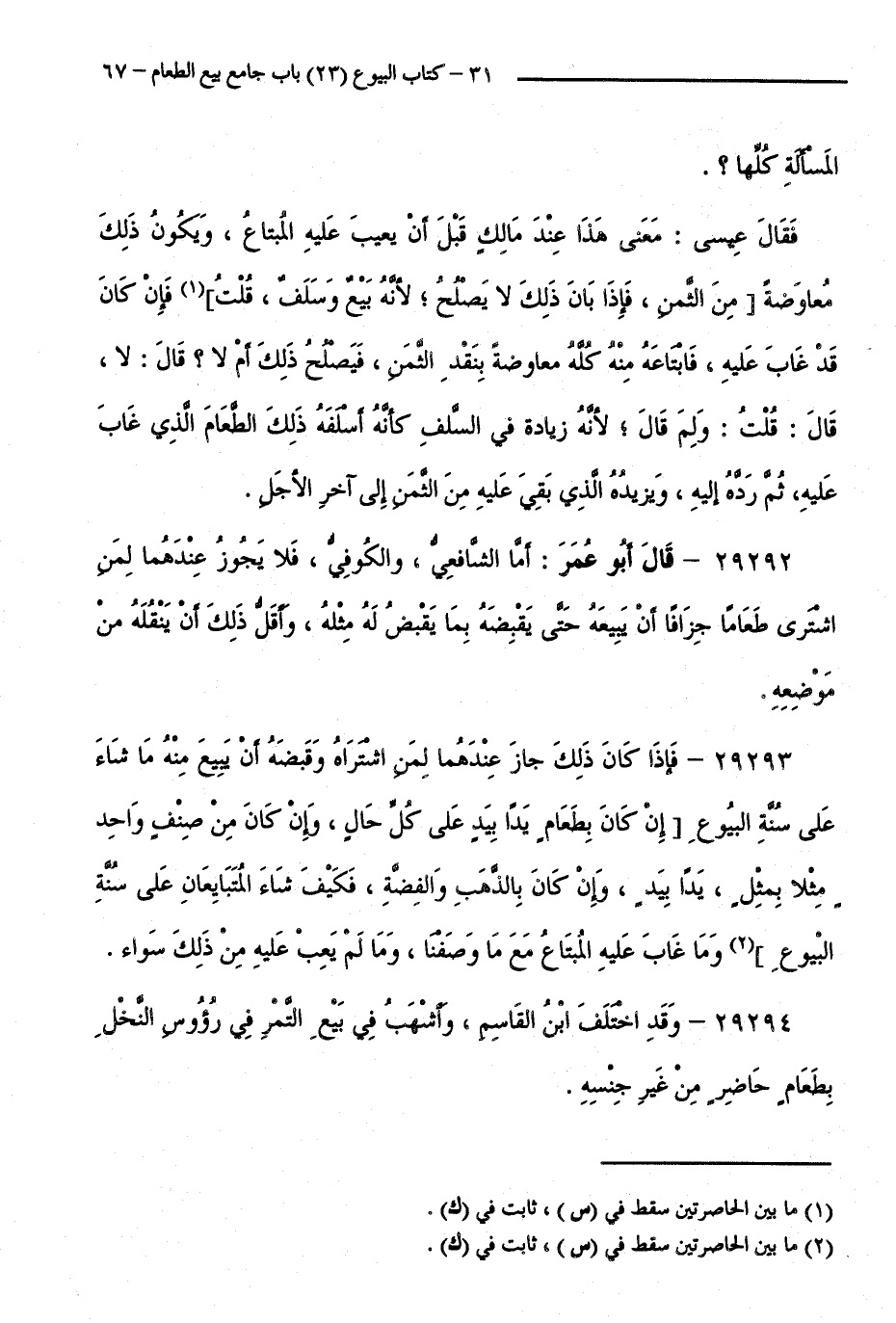 29294 - وَقَدِ اخْتَلَفَ ابْنُ الْقَاسِمِ، وَأَشْهَبُ فِي بَيْعِ التَّمْرِ فِي رُءُوسِ النَّخْلِ بِطَعَامٍ حَاضِرٍ مِنْ غَيْرِ جِنْسِهِ.