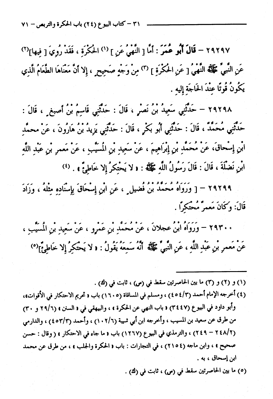 29298 - حَدَّثَنِي سَعِيدُ بْنُ نَصْرٍ، قَالَ: حَدَّثَنِي قَاسِمُ بْنُ أَصْبَغَ، قَالَ: حَدَّثَنِي مُحَمَّدٌ، قَالَ حَدَّثَنِي أَبُو بَكْرٍ، قَالَ حَدَّثَنِي يَزِيدُ بْنُ هَارُونَ، عَنْ مُحَمَّدِ بْنِ إِسْحَاقَ، عَنْ مُحَمَّدِ بْنِ إِبْرَاهِيمَ، عَنْ سَعِيدِ بْنِ الْمُسَيَّبِ، عَنْ مَعْمَرِ بْنِ عَبْدِ اللَّهِ بْنِ نَضْلَةَ، قَالَ: قَالَ رَسُولُ اللَّهِ صَلَّى اللَّهُ عَلَيْهِ وَسَلَّمَ: "لَا يَحْتَكِرُ إِلَّا خَاطِئٌ ".