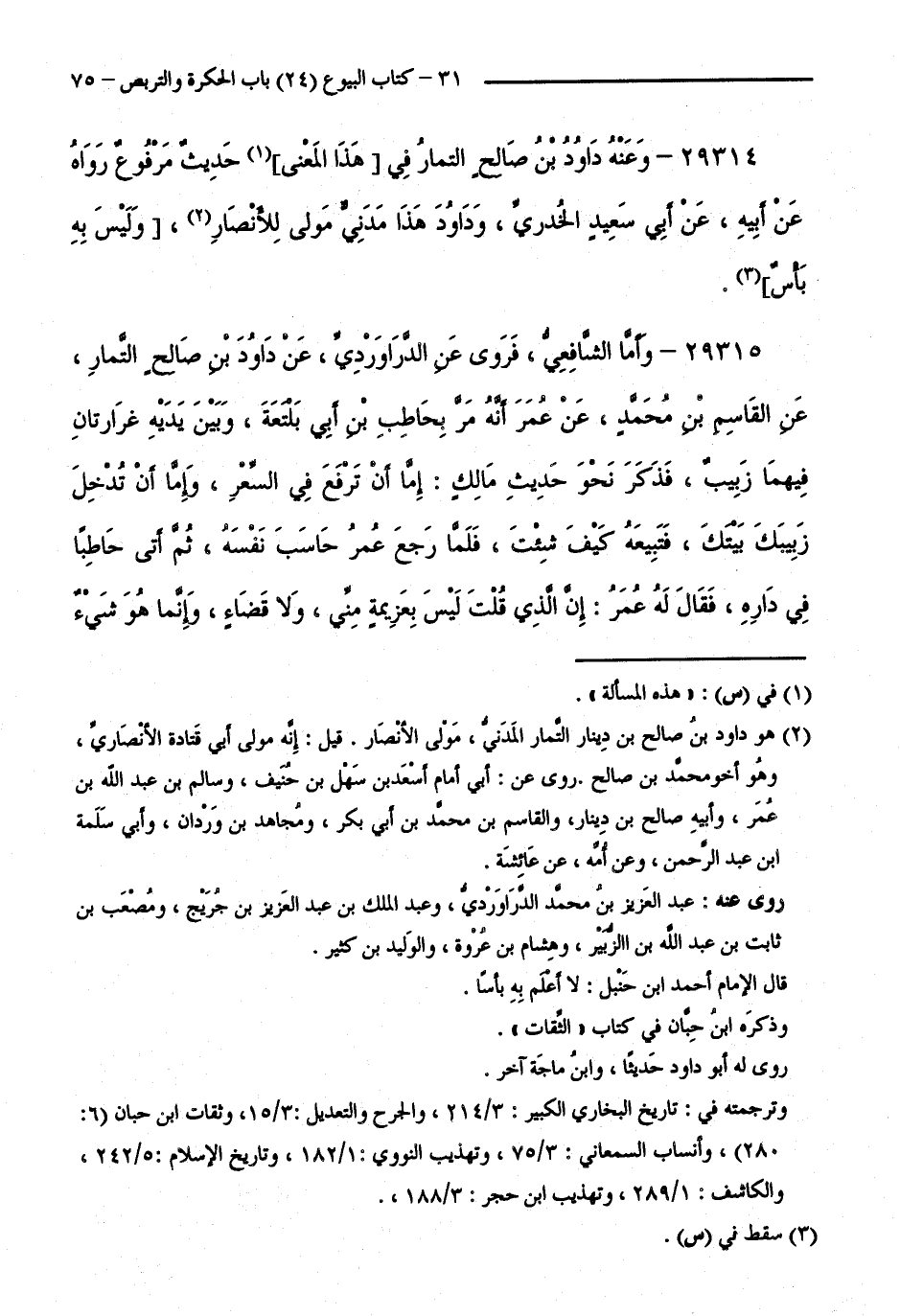 29315 - وَأَمَّا الشَّافِعِيُّ، فَرَوَى عَنِ الدَّرَاوَرْدِيِّ، عَنْ دَاوُدَ بْنِ صَالِحٍ التَّمَّارِ، عَنِ الْقَاسِمِ بْنِ مُحَمَّدٍ، عَنْ عُمَرَ أَنَّهُ مَرَّ بِحَاطِبِ بْنِ أَبِي بَلْتَعَةَ، وَبَيْنَ يَدَيْهِ غِرَارَتَانِ، فِيهِمَا زَبِيبٌ، فَذَكَرَ نَحْوَ حَدِيثِ مَالِكٍ: إِمَّا أَنْ تَرْفَعَ فِي السِّعْرِ، وَإِمَّا أَنْ تُدْخِلَ زَبِيبَكَ بَيْتَكَ، فَتَبِيعَهُ كَيْفَ شِئْتَ، فَلَمَّا رَجَعَ عُمَرُ حَاسَبَ نَفْسَهُ، ثُمَّ أَتَى حَاطِبًا فِي دَارِهِ، فَقَالَ لَهُ عُمَرُ: إِنَّ الَّذِي قُلْتُ لَيْسَ بِعَزِيمَةٍ مِنِّي، وَلَا قَضَاءٍ، وَإِنَّمَا هُوَ شَيْءٌ