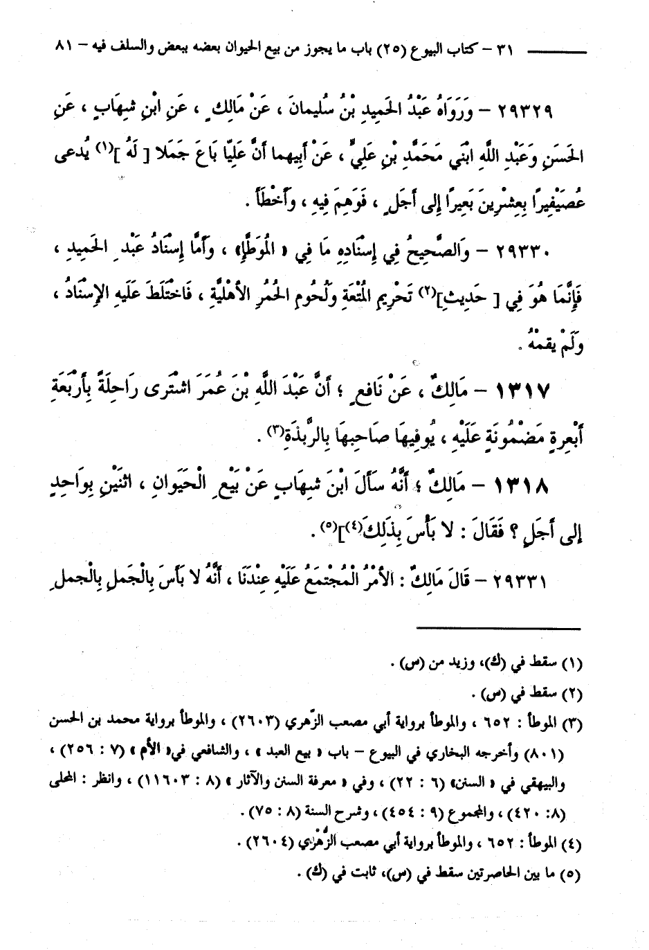 1317 - مَالِكٌ، عَنْ نَافِعٍ، أَنَّ عَبْدَ اللَّهِ بْنَ عُمَرَ اشْتَرَى رَاحِلَةً بِأَرْبَعَةِ أَبْعِرَةٍ مَضْمُونَةٍ عَلَيْهِ، يُوَفِّيهَا صَاحِبُهَا بِالرَّبَذَةِ.
