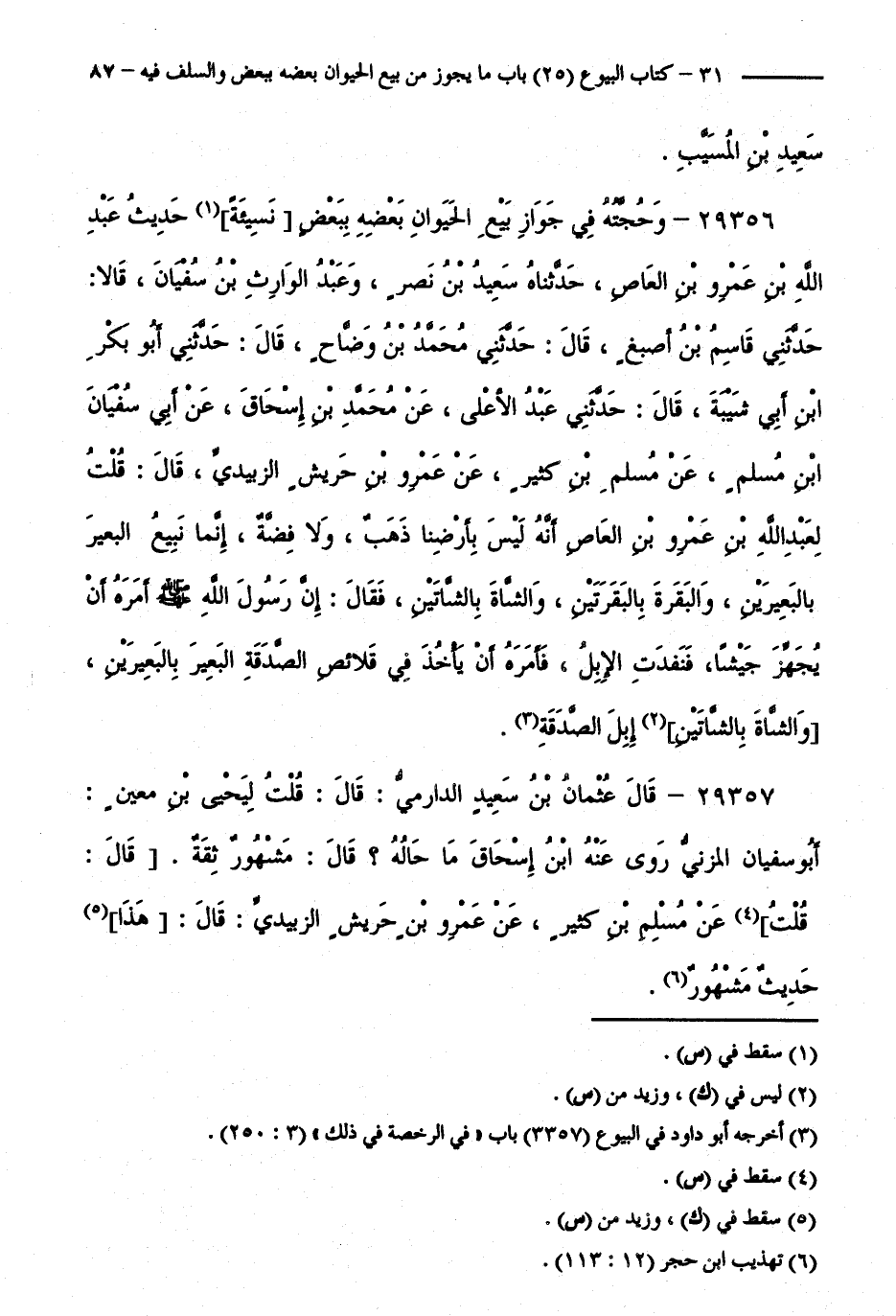 29356 - وَحُجَّتُهُ فِي جَوَازِ بِيعَ الْحَيَوَانِ بَعْضِهِ بِبَعْضٍ نَسِيئَةً حَدِيثُ عَبْدِ اللَّهِ بْنِ عَمْرِو بْنِ الْعَاصِ، حَدَّثَنَاهُ سَعِيدُ بْنُ نَصْرٍ، وَعَبْدُ الْوَارِثِ بْنُ سُفْيَانَ، قَالَا: حَدَّثَنِي قَاسِمُ بْنُ أَصْبَغَ، قَالَ: حَدَّثَنِي مُحَمَّدُ بْنُ وَضَّاحٍ، قَالَ: حَدَّثَنِي أَبُو بَكْرِ بْنُ أَبِي شَيْبَةَ، قَالَ: حَدَّثَنِي عَبْدُ الْأَعْلَى، عَنْ مُحَمَّدِ بْنِ إِسْحَاقَ، عَنْ أَبِي سُفْيَانَ بْنِ مُسْلِمٍ، عَنْ مُسْلِمِ بْنِ كَثِيرٍ، عَنْ عَمْرِو بْنِ حَرِيشٍ الزُّبَيْدِيِّ، قَالَ:قُلْتُ لِعَبْدِ اللَّهِ بْنِ عَمْرِو بْنِ الْعَاصِ إِنَّهُ لَيْسَ بِأَرْضِنَا ذَهَبٌ، وَلَا فِضَّةٌ، إِنَّمَا نَبِيعُ الْبَعِيرَ بِالْبَعِيرَيْنِ، وَالْبَقَرَةَ بِالْبَقَرَتَيْنِ، وَالشَّاةَ بِالشَّاتَيْنِ، فَقَالَ: إِنَّ رَسُولَ اللَّهِ صَلَّى اللَّهُ عَلَيْهِ وَسَلَّمَ أَمَرَهُ أَنْ يُجَهِّزَ جَيْشًا، فَنَفِدَتِ الْإِبِلُ، فَأَمَرَهُ أَنْ يَأْخُذَ فِي قَلَائِصِ الصَّدَقَةِ الْبَعِيرَ بِالْبَعِيرَيْنِ، وَالشَّاةَ بِالشَّاتَيْنِ إِبِلَ الصَّدَقَةِ.