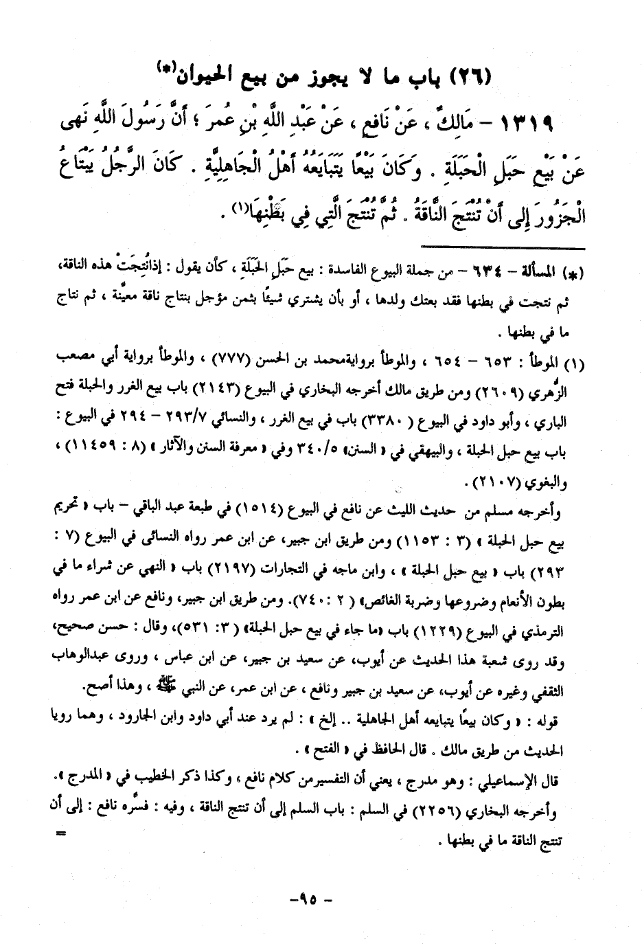 1319 - مَالِكٌ، عَنْ نَافِعٍ، عَنْ عَبْدِ اللَّهِ بْنِ عُمَرَ،أَنَّ رَسُولَ اللَّهِ نَهَى عَنْ بَيْعِ حَبَلِ الْحَبَلَةِ، وَكَانَ بَيْعًا يَتَبَايَعُهُ أَهْلُ الْجَاهِلِيَّةِ، كَانَ الرَّجُلُ يَبْتَاعُ الْجَزُورَ إِلَى أَنْ تُنْتَجَ النَّاقَةُ. ثُمَّ تُنْتَجُ الَّتِي فِي بَطْنِهَا.