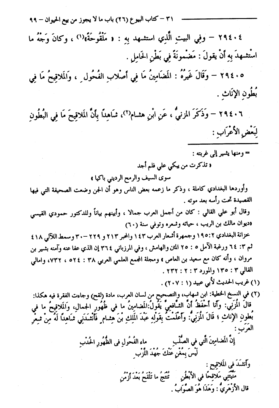 29406 - وَذَكَرَ الْمُزَنِيُّ، عَنِ ابْنِ هِشَامٍ، شَاهِدًا بِأَنَّ الْمَلَاقِيحَ مَا فِي الْبُطُونِ لِبَعْضِ الْأَعْرَابِ: